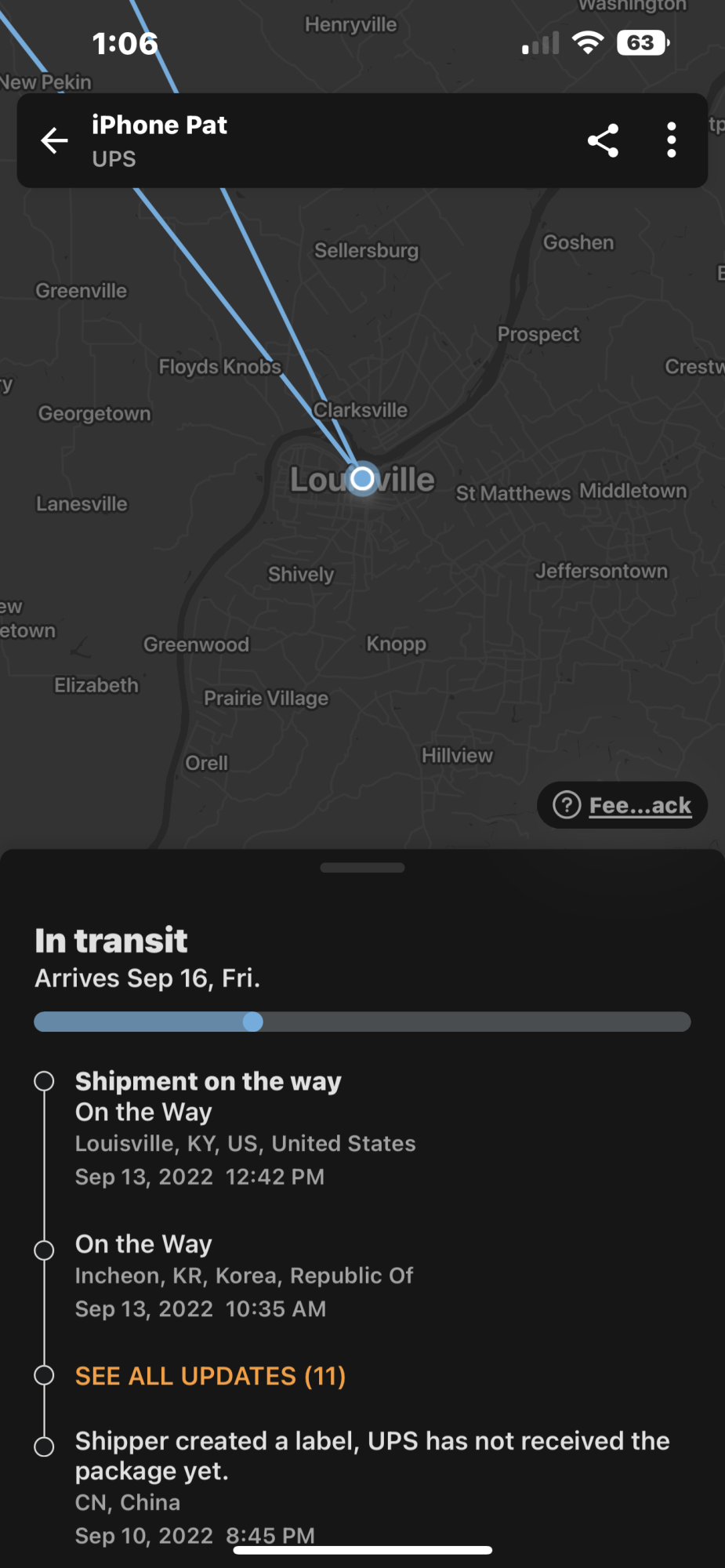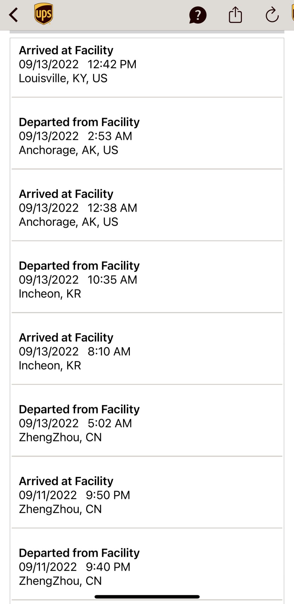 | 09/13/2022 12:42 P.M. | On the Way Arrived at Facility Louisville, KY, United States |