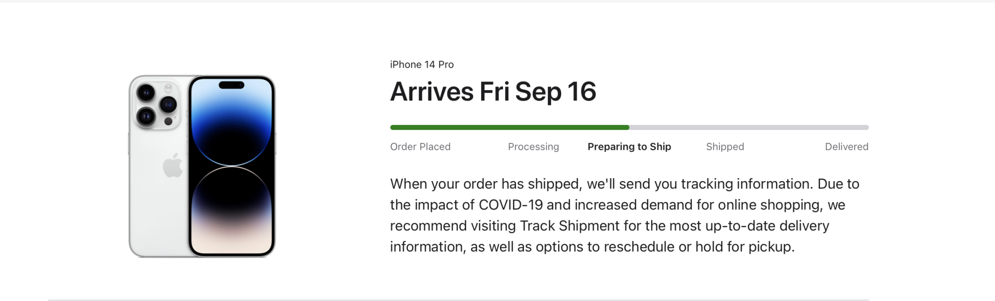 Funny in the Apple store it says preparing to ship. However, I received a UPS tracking number on Sunday 9/11 and it currently says it's in AK