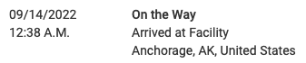 | 9/14/2022 12:38 AM | On the Way Arrived at Facility Anchorage, AK, United States |