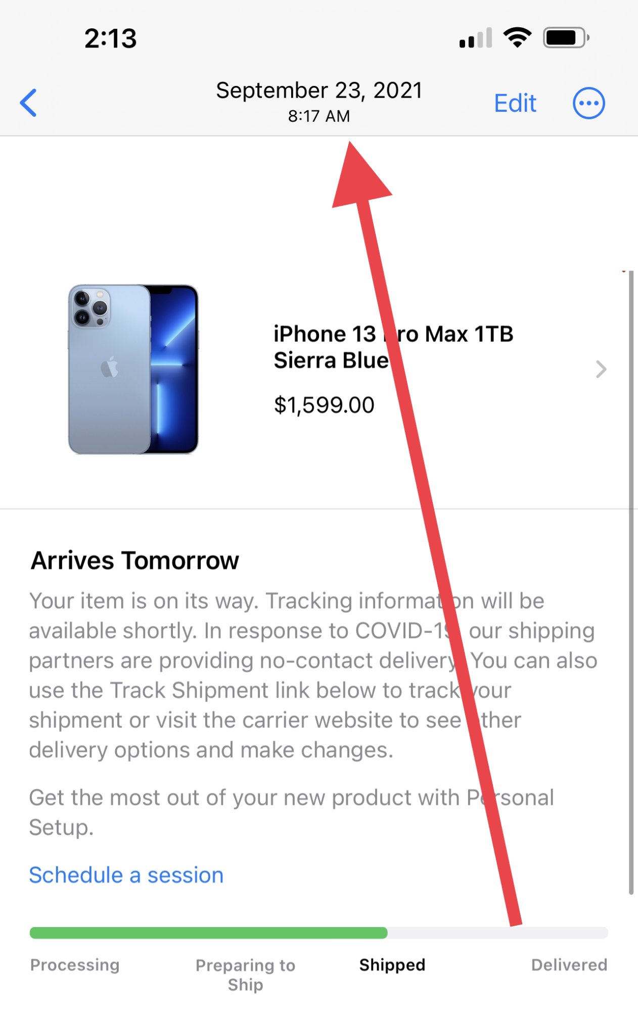 Last year I got mine at 8:17AM Eastern. But it was for in store pickup on launch day cause I decided on Sierra Blue late and dates slipped by then for delivery. That’s why this year, I made sure to decide by 7:59AM eastern lolFolks! Expect to receive an email and tracking number assigned to your order from Apple tomorrow at 8:00PST. Also, expect your status to change to "SHIPPED"
