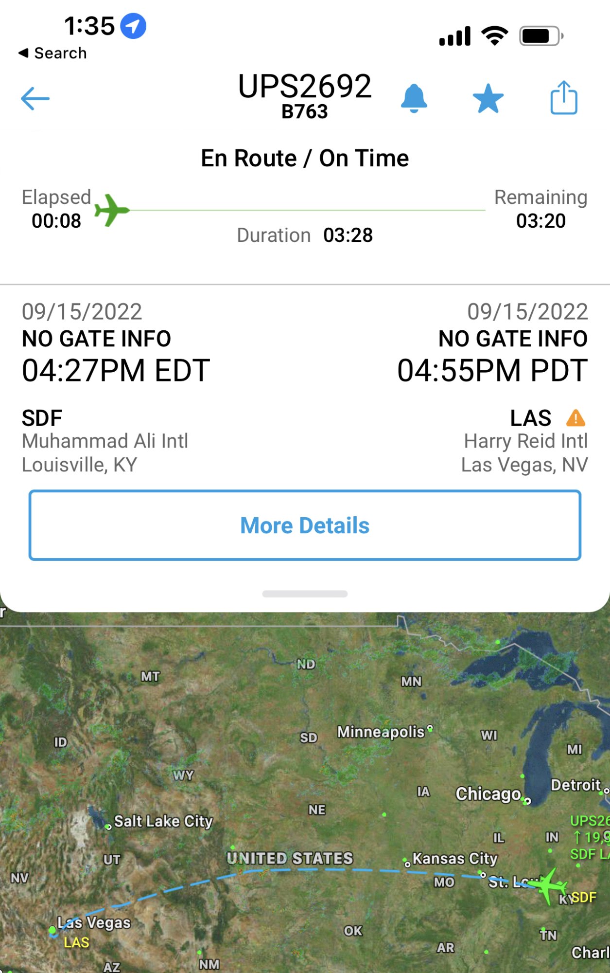 Select only UPS on the left: https://flightaware.com/live/findflight?origin=KSDF&destination=KIADHow can I find my flight info since my watch and phone left KY at3:41pm so SDF to IAD