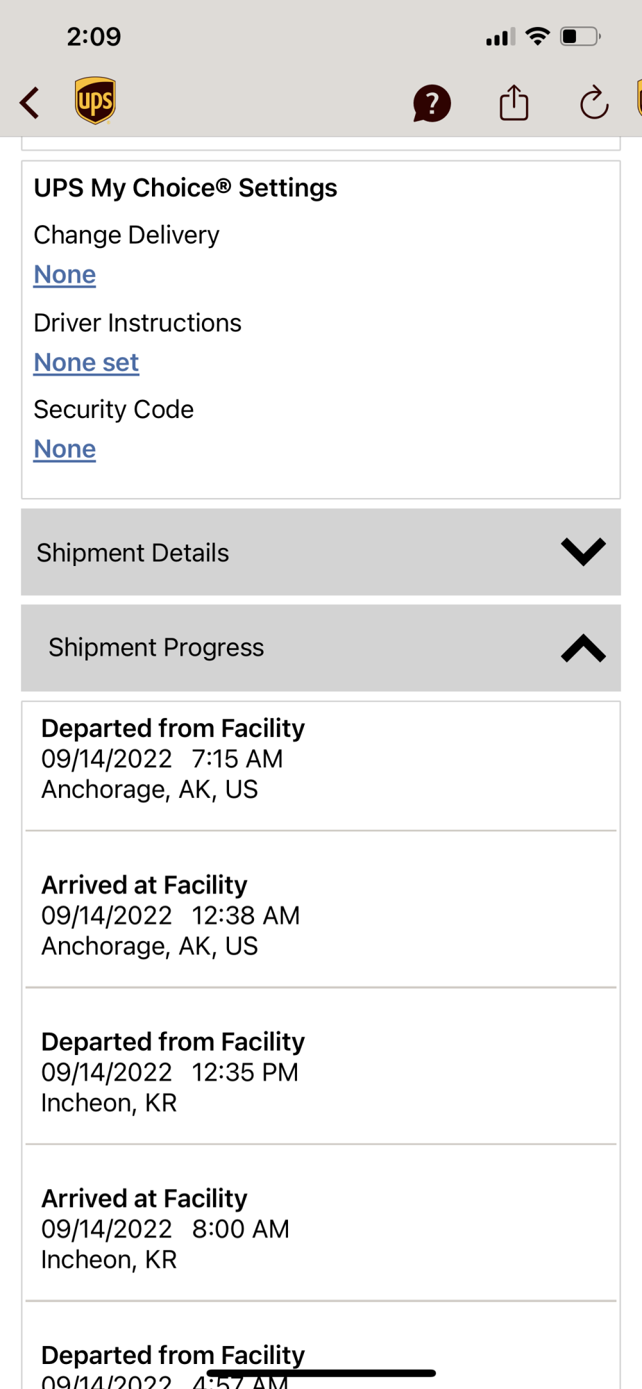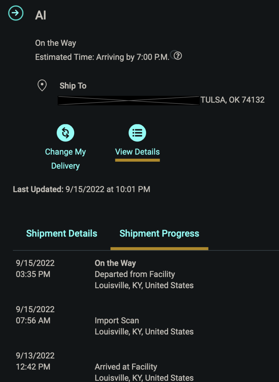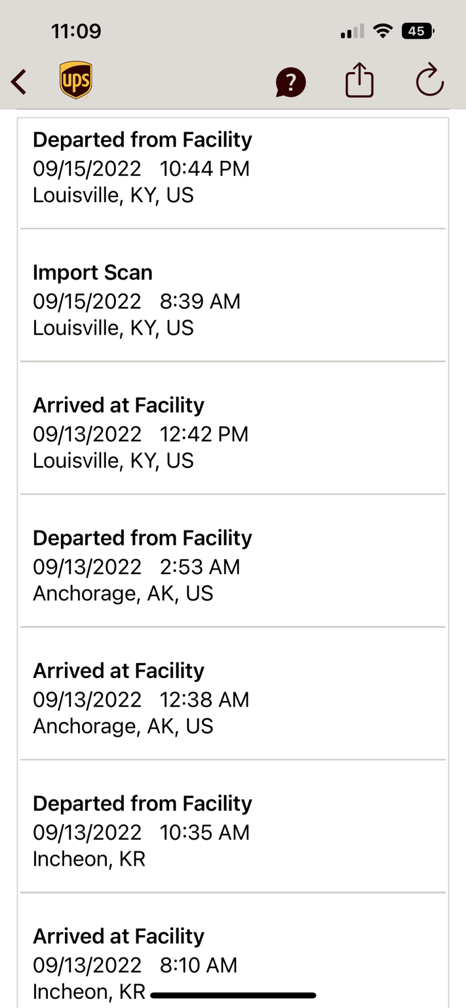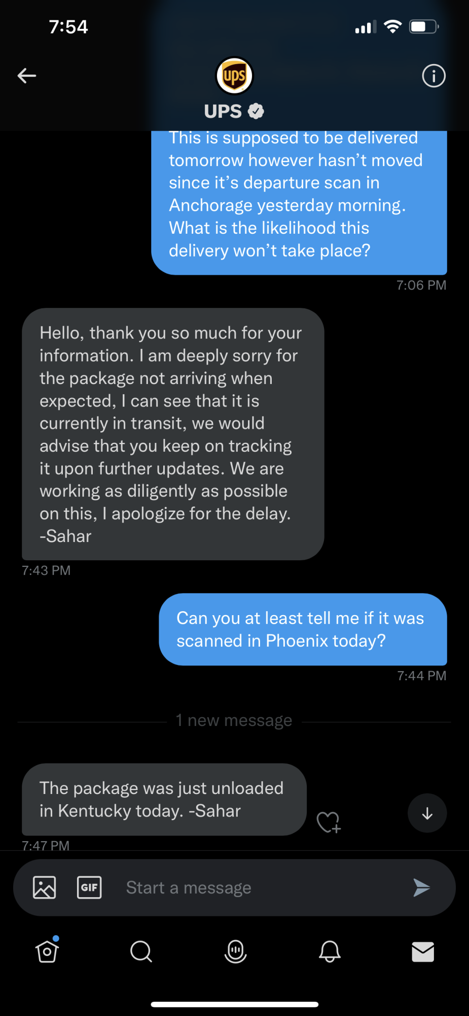 Interesting. I hit UPS on Twitter cause why not. They said it was “unloaded in KY today” so either their tracking is effed or it fell out of the container and rolled down the runway until someone found it in the grass.