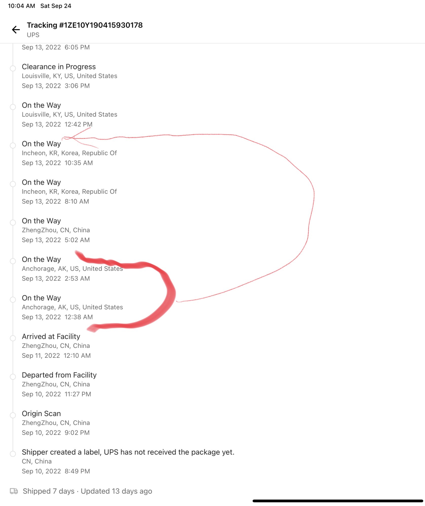 Here is airship notice what it gets of UPS scans, that the anchorage stuff is shown erroneously before Korea because of the day difference by 11 hours across international date line in pacific. That also can be confusing til you realize that. UPS has smarter programming and adjusts for the time line so you see where it really is — once it populates but from China to Louisville and sometimes your house their scanning is delayed closer to end.