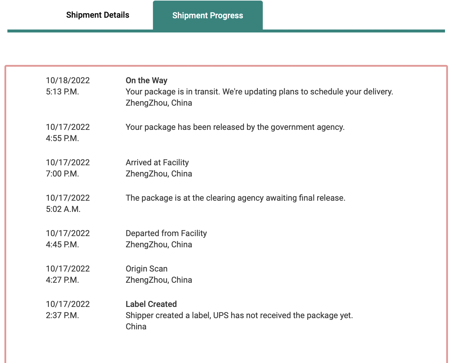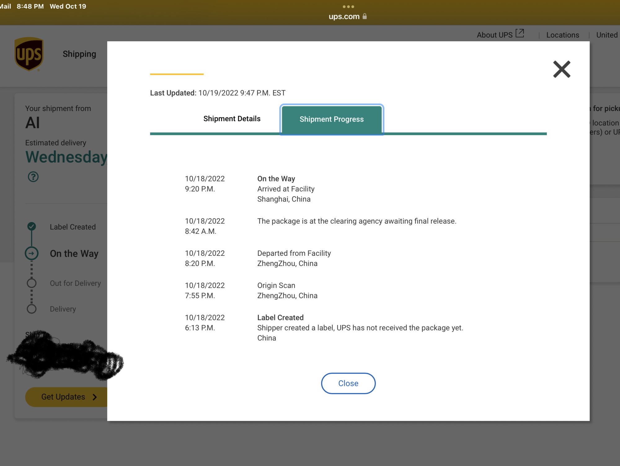 Mine updated yesterday and now says shipped but is at a facility in Shanghai CN says 9:20pm. But haven’t seen movement today ☹️. UPS says delivery should be 10/26/2022