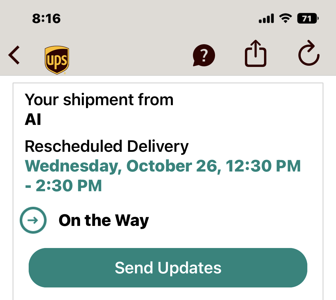 What’s funny is UPS shows that package should be here on 10/25/22. Apple moved the estimate from 10/26/22 to 10/24/22Did it come UPS or postal