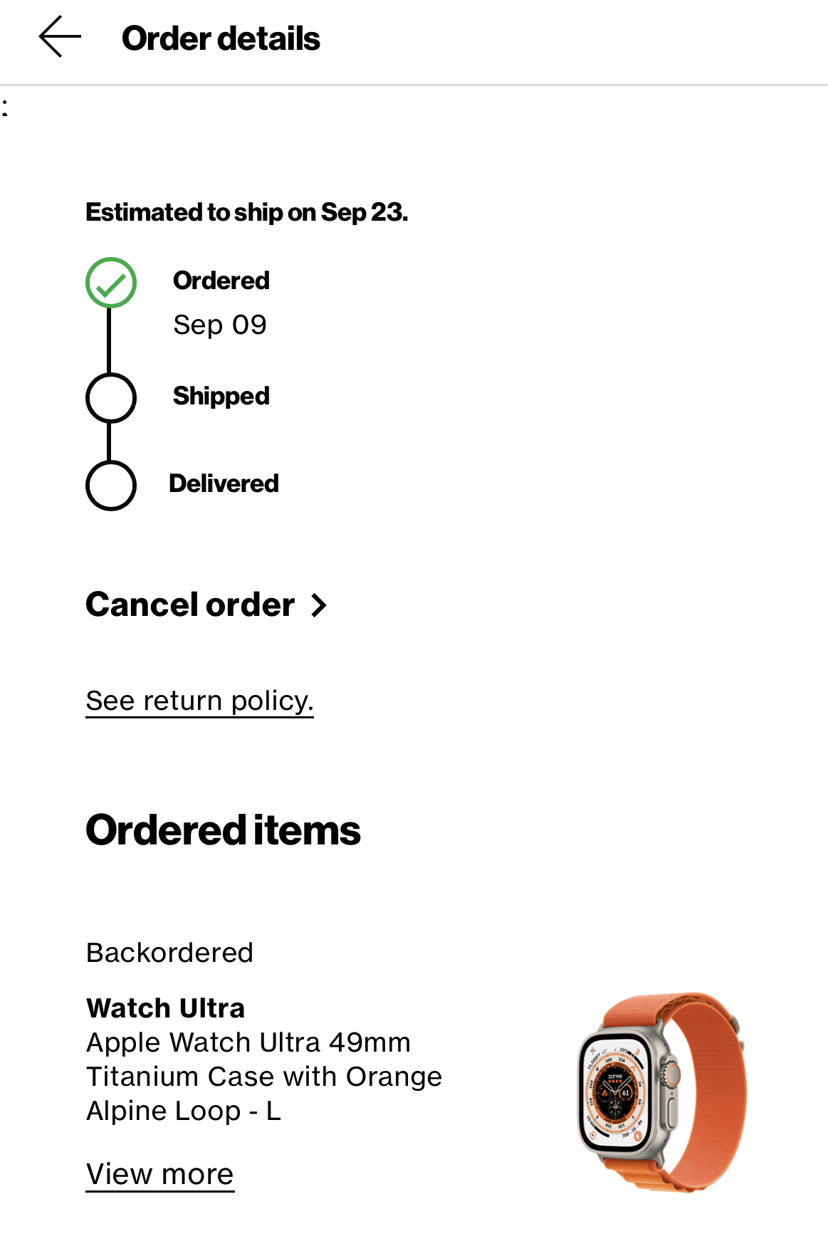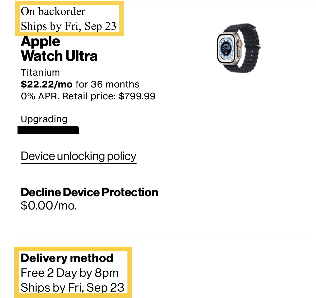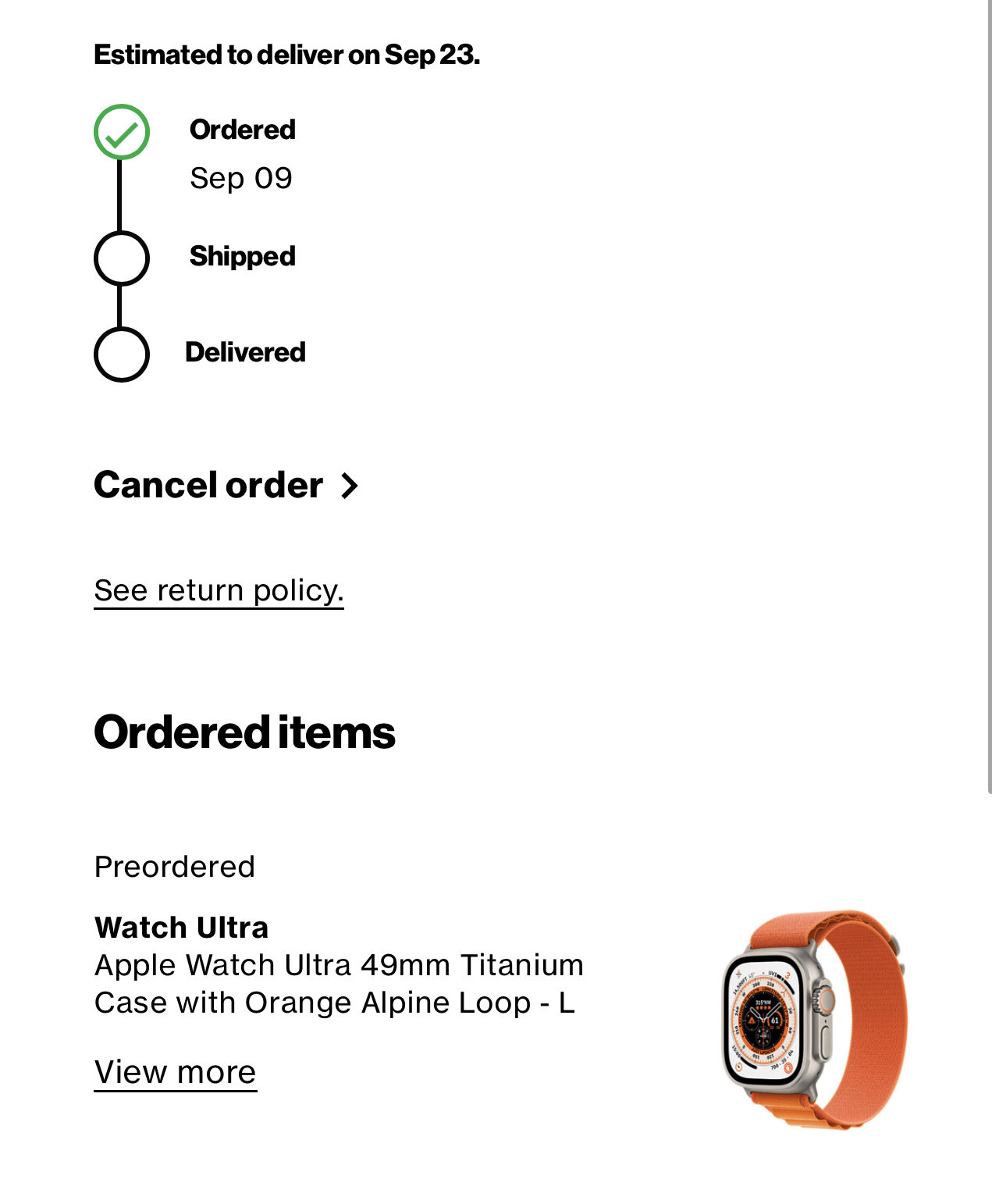 Pre ordered Apple Watch Ultra Orange Alpine Loop Large. 9/23 Delivery date. I did a trade in, so I didnt need to put anything down so no card to charge to gauge shipment.