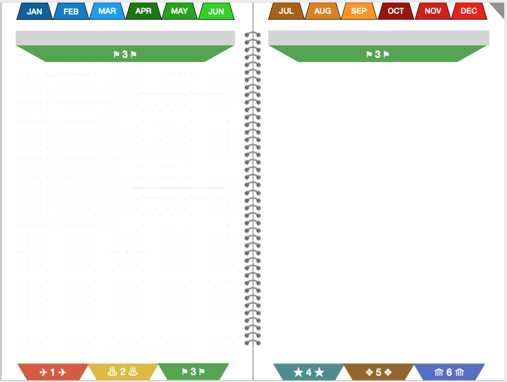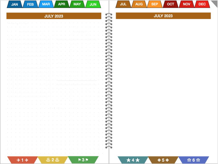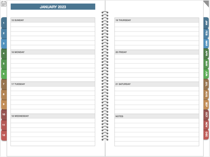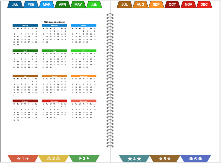 Along the top are tabs that take you to the beginning of each month. The dog-ear in the upper right corner will take you back to the cover from anywhere in the notebook. (helpful when you are on a page with confidential information and need to hide it quickly)