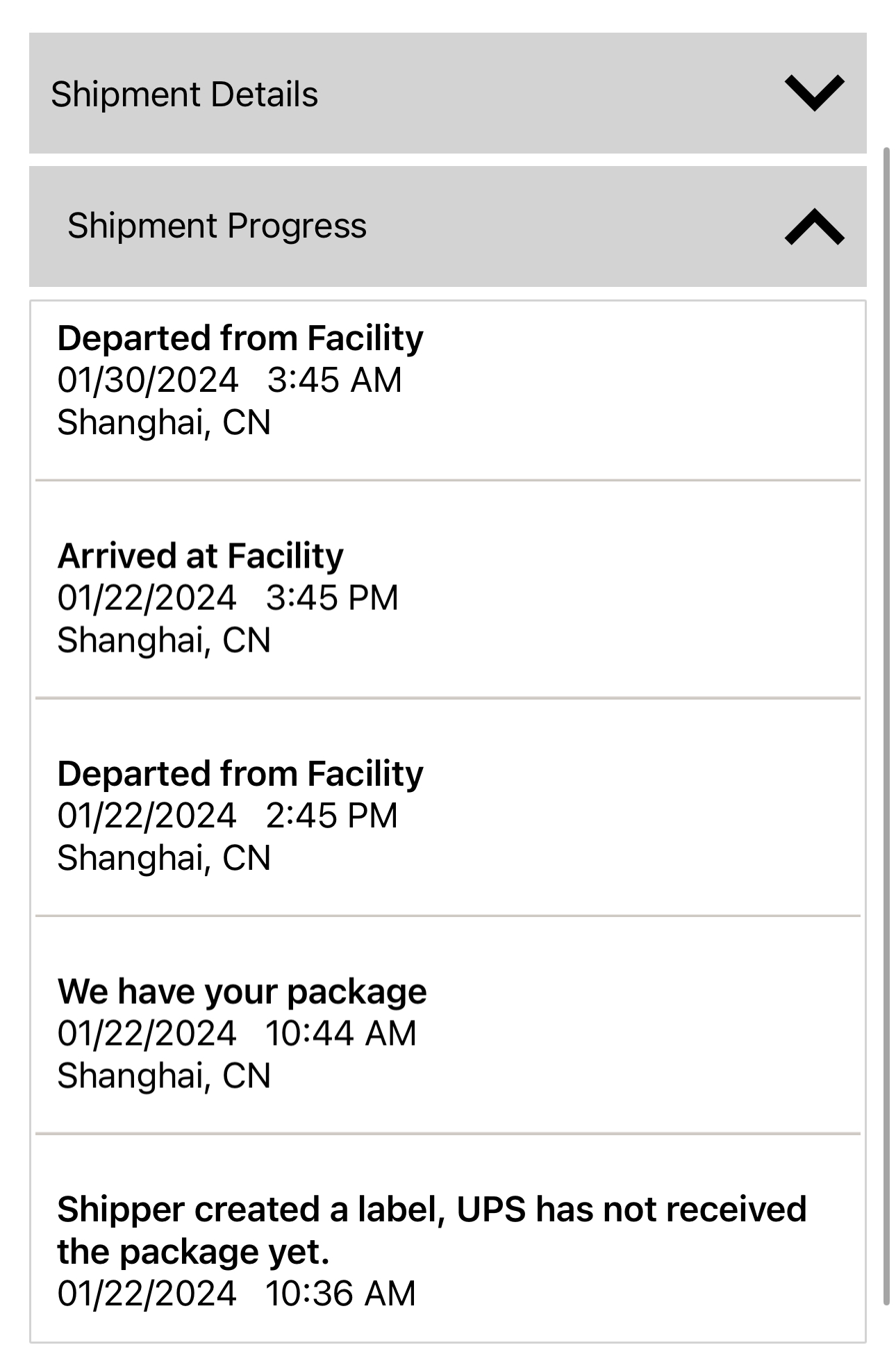 | 01/30/2024 4:11 A.M. | On the Way Departed from Facility Shanghai, China |