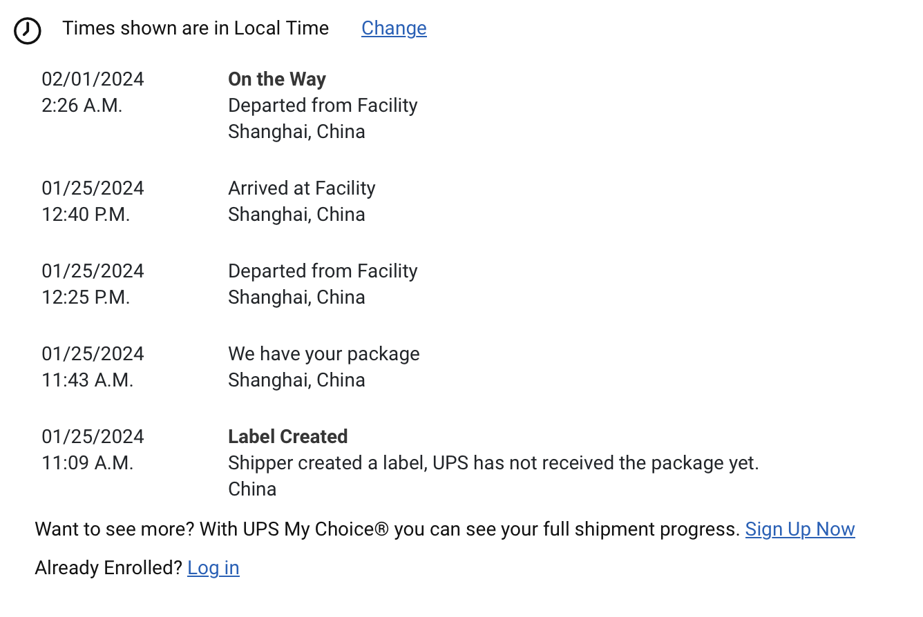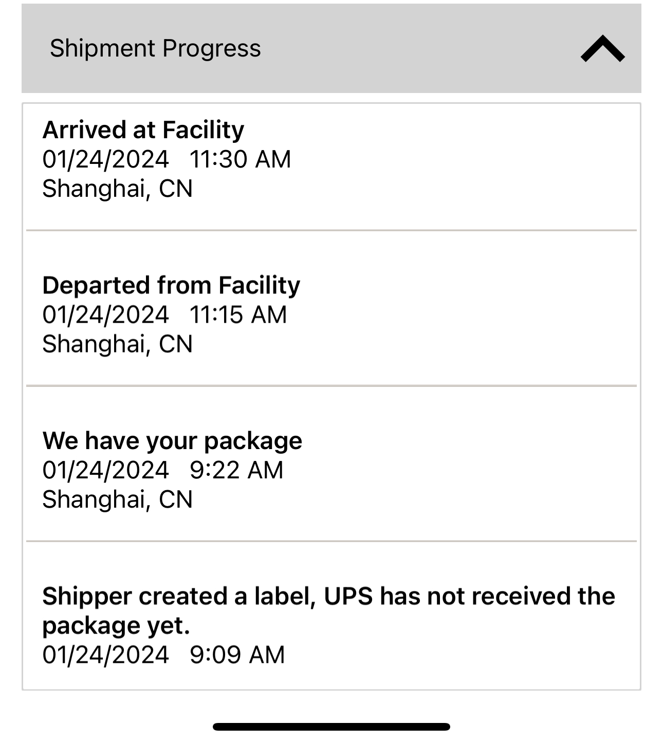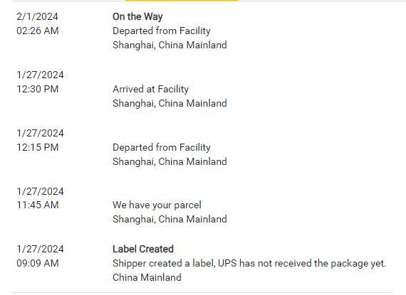 Another flight is leaving in 26 minutes, plenty of time even if it leaves late today or early tomorrow morning. UPS still says my delivery is scheduled for 2/2. 🤞My Vision Pro also seems to be "stuck" at the Shanghai, CN Facility.