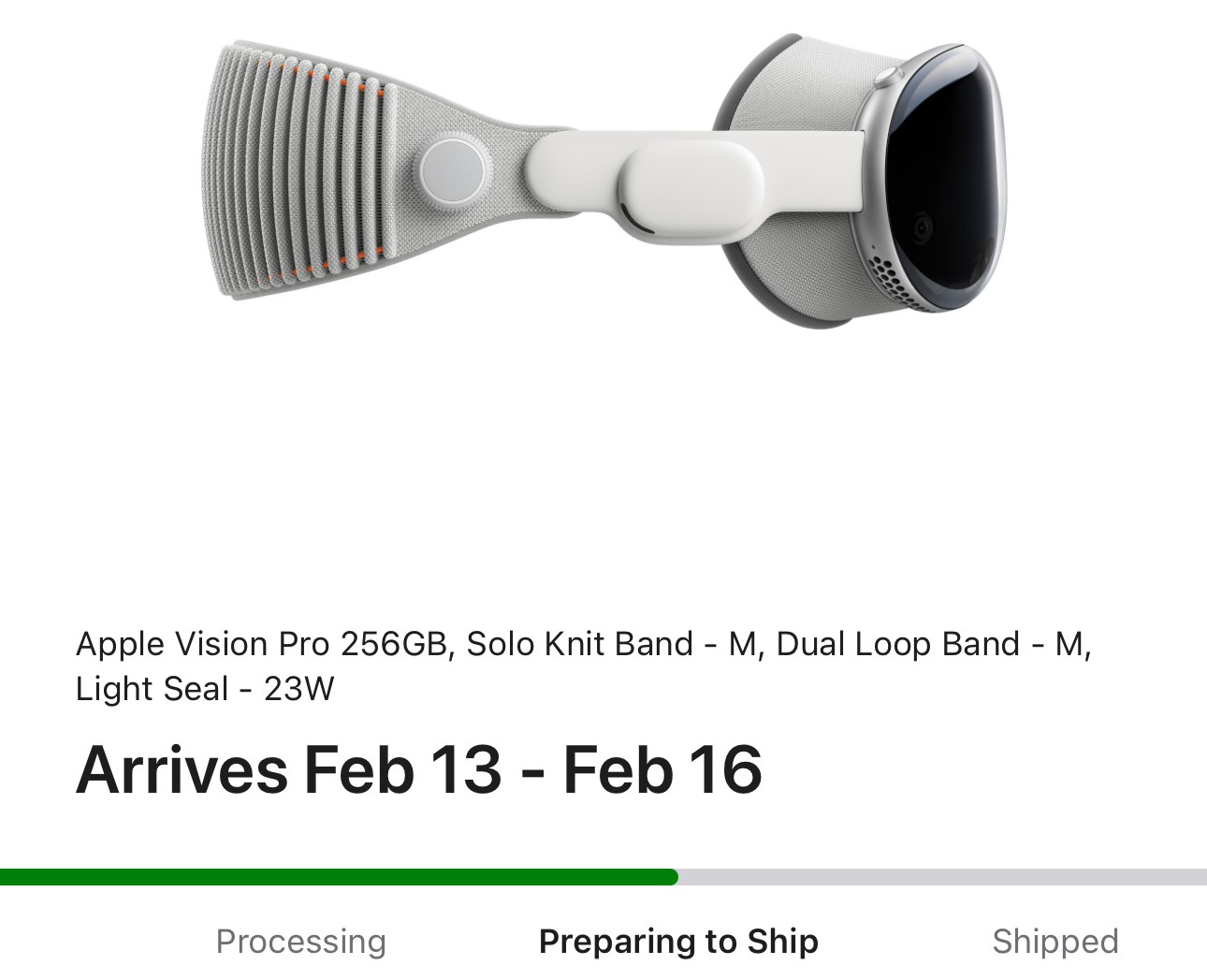 Yes, a few people. You won’t get a tracking number from Apple until your Vision Pro is broken apart from the crate into individual shipments in the US. My UPS tracking number (that showed up in the UPS app) still shows that it’s in Shanghai. UPS and Apple both still say 2/2 delivery. There’s a flight leaving Shanghai soon that it could be on, and at least one more tomorrow.I checked the two most recent pages and couldn’t find anything… Anybody else “Preparing to ship” with a delivery date of Feb 2 still? Should I be worried that others have tracking info already? I ordered within 5 mins of preorders going live, and I was charged over a week ago.