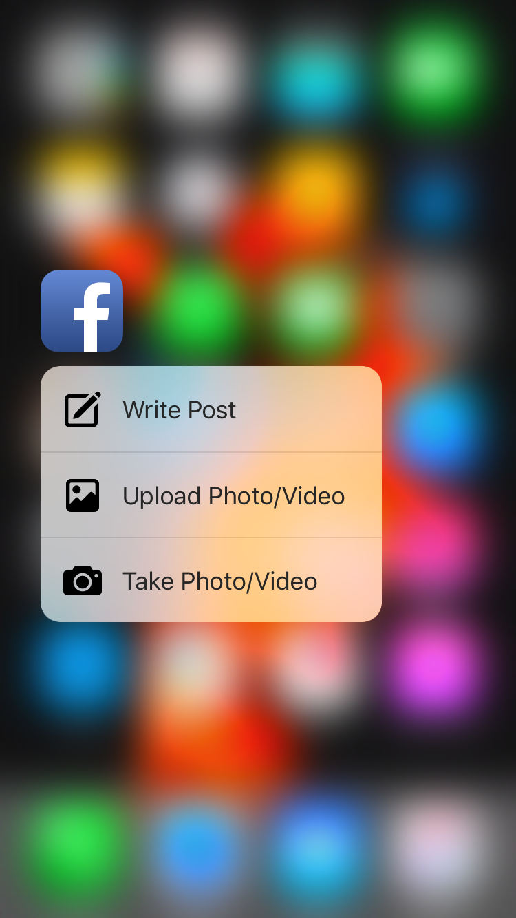 Facebook is now compatible with 3D Touch, you can take photo/video, upload photo/view or write a post. Just thought I'd let you all know!!