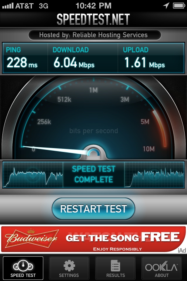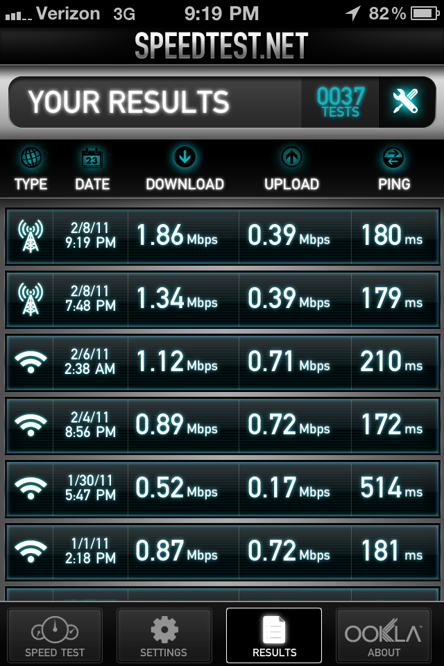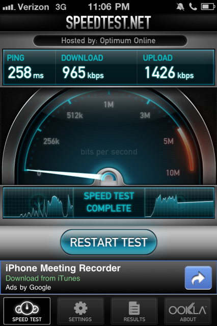 It was late, and I would not expect to get this during the day, in fact I was unable to get that high a speed out of Verizon again so its clear these guys are pretty slow, but hey, I have a phone I can actually talk on and be heard!
