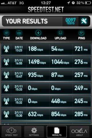 Pretty fail speeds here today. Note that these numbers are in kbps. I'm on Long Island on ATT. However I do believe the building I'm in uses microcells, and if so they are clearly epic fail.