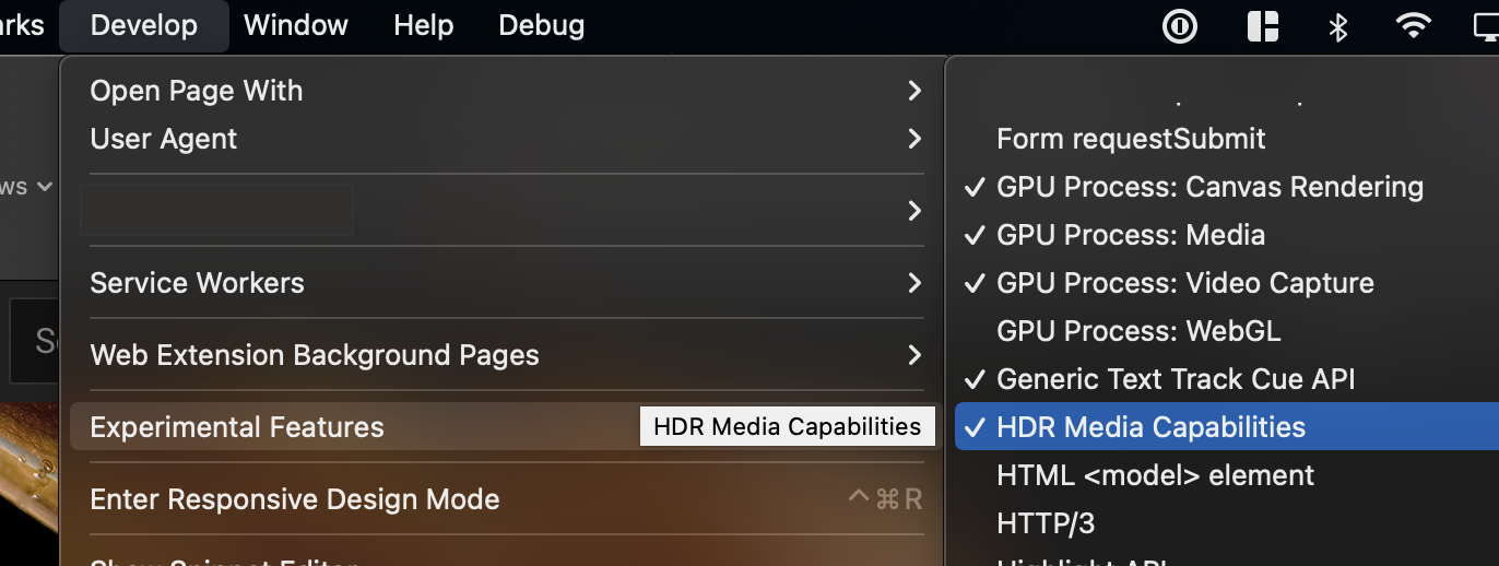 VP9 decoder) — you can enable the Develop menu using the checkbox at the bottom of the Advanced tab in Safari preferences ("Show Develop menu in menu bar"), then enable those features from the menu if they aren't already checked.