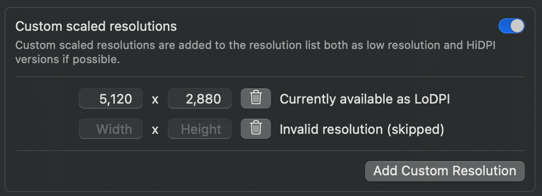 While using BetterDisplay's custom resolution, I can scale it to 5K, but it only offers LoDPI.