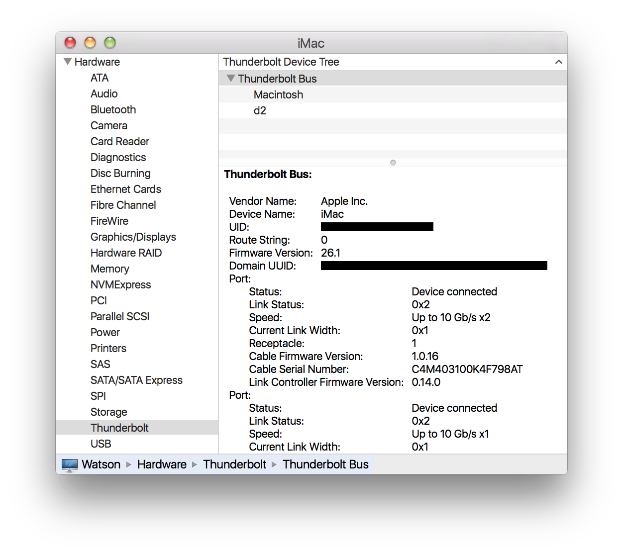 You'll find on iMac that performance would be same either daisychained or one into each port. With right drives, you could get up to 1.3GB/sec on your iMac.Right, but that's probably in one enclosure. I have 2 enclosures that each have 2 drives (2TB each) to make the 4TB RAID0. I want to access both enclosures as one 8TB RAID0. I don't think daisy chaining the 2 enclosures would work as expected hence the desire for two separate buses.