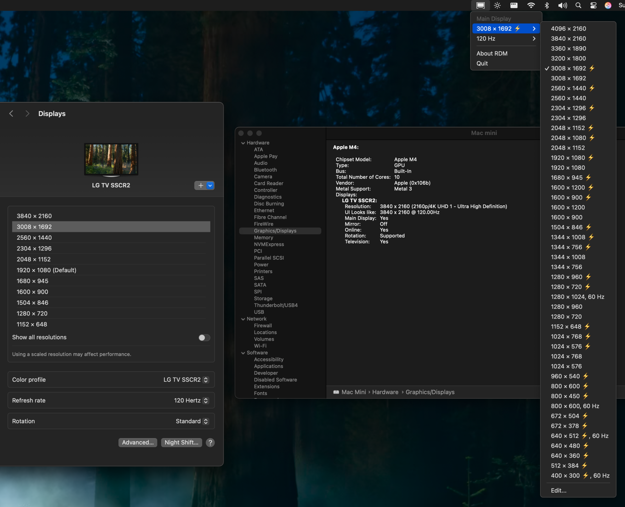 - HDMI 2.1: When connected to the LG CX Oled TV via the HDMI 2.1 port, I can get the full 120Hz refresh rate, but the desired HiDPI still isn't available.