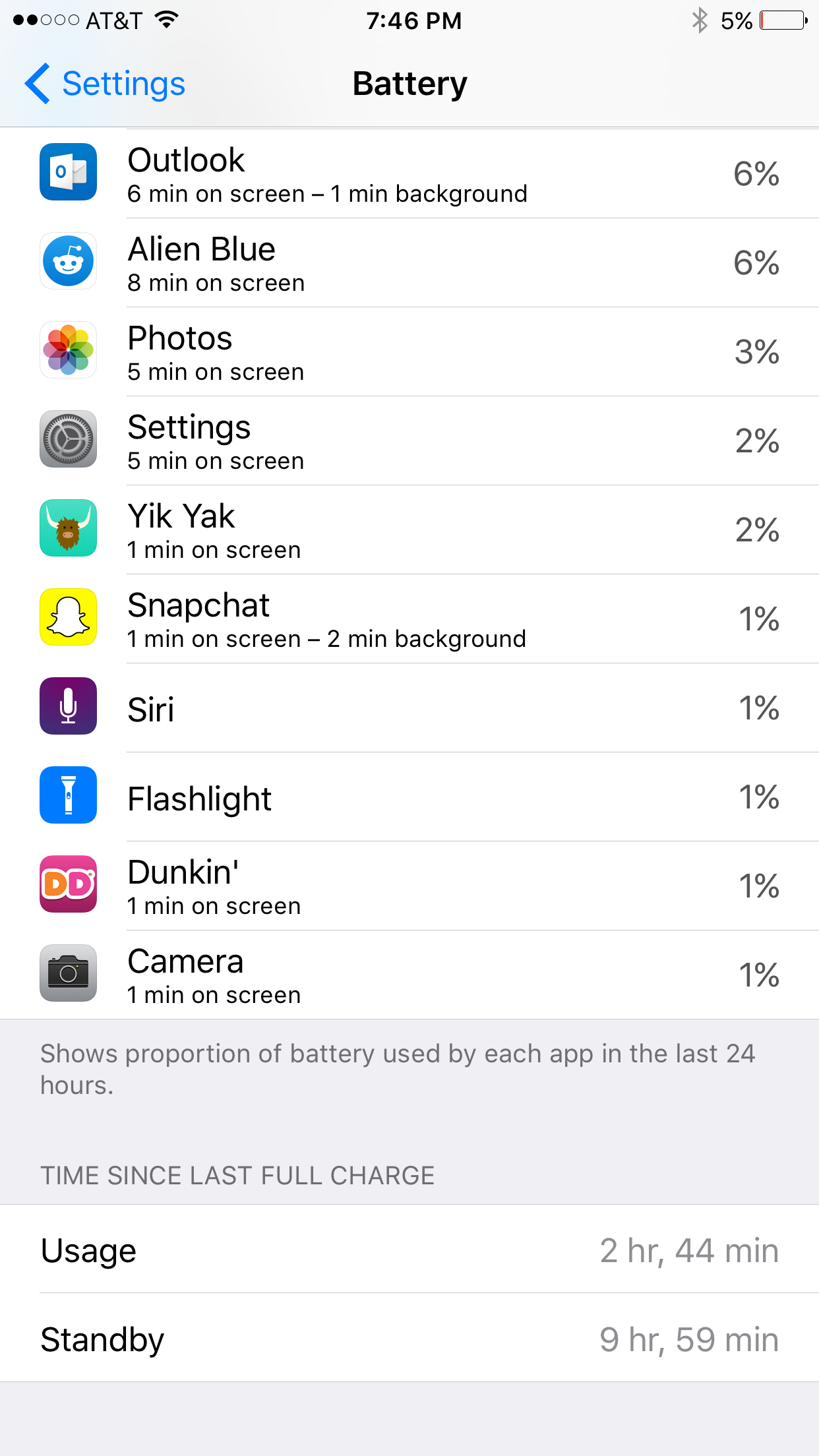 And here it is again a couple hours later - it actually died right at 5%, so I had to plug it back in just to get these screenshots of the usage stats. One thing that's interesting is that the battery was closer to normal during the drop from 23% to 5%, but it's still dying really early: