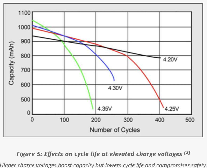 BU will have us believe that charging above 4.2V gives marginally more capacity for rapidly decreasing cycle life.