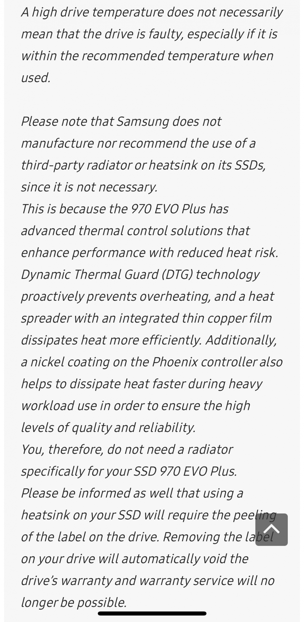 'advanced thermal control solution' means - throttling.i was searching yesterday for new candidates and also found that many ppl say that EVO 970 is idleing at 55-60. it seems that this line really is hotter. found this response from samsung. i guess i'll just remove the heatsink, that i have right now and leave disk without.