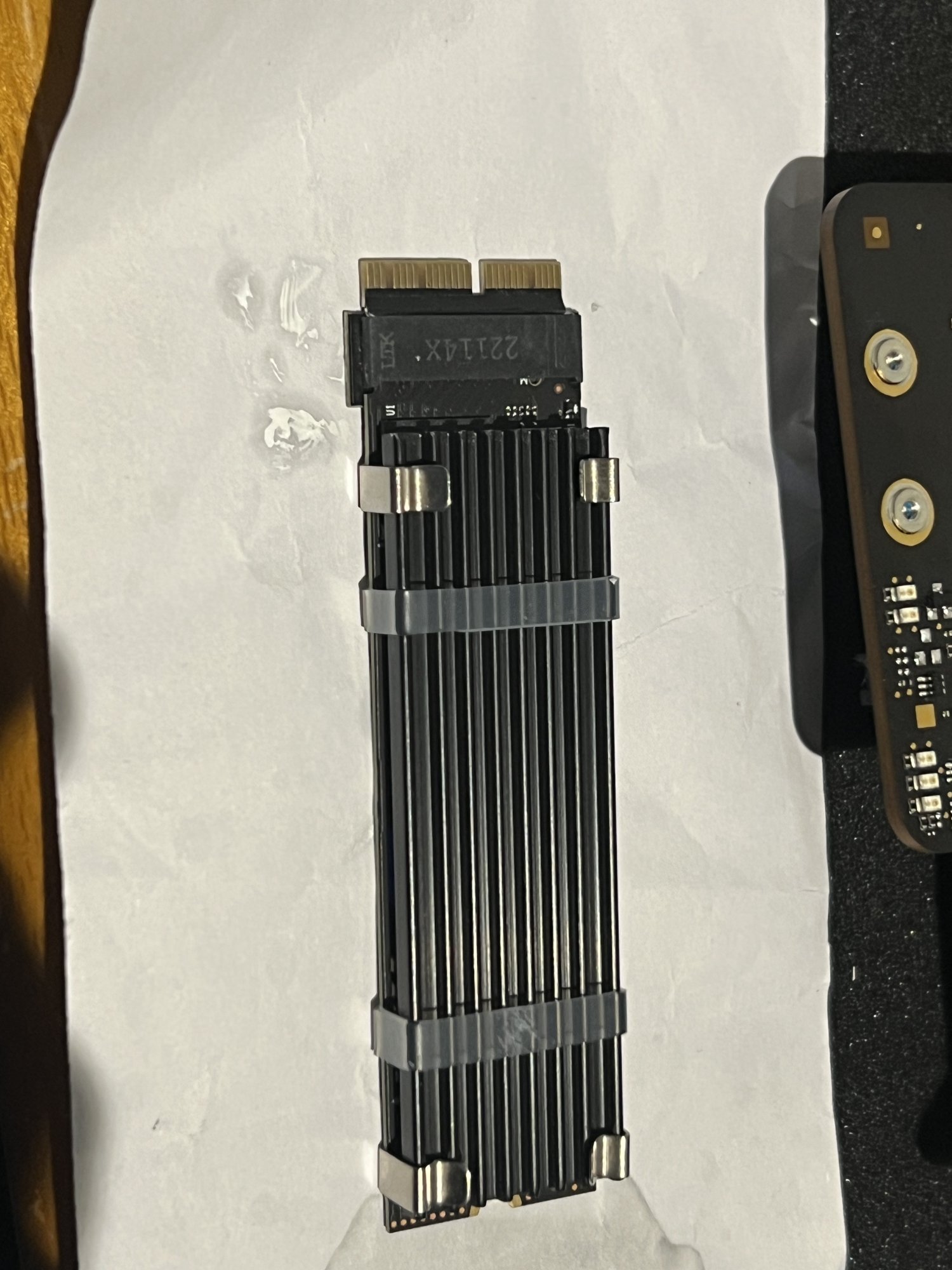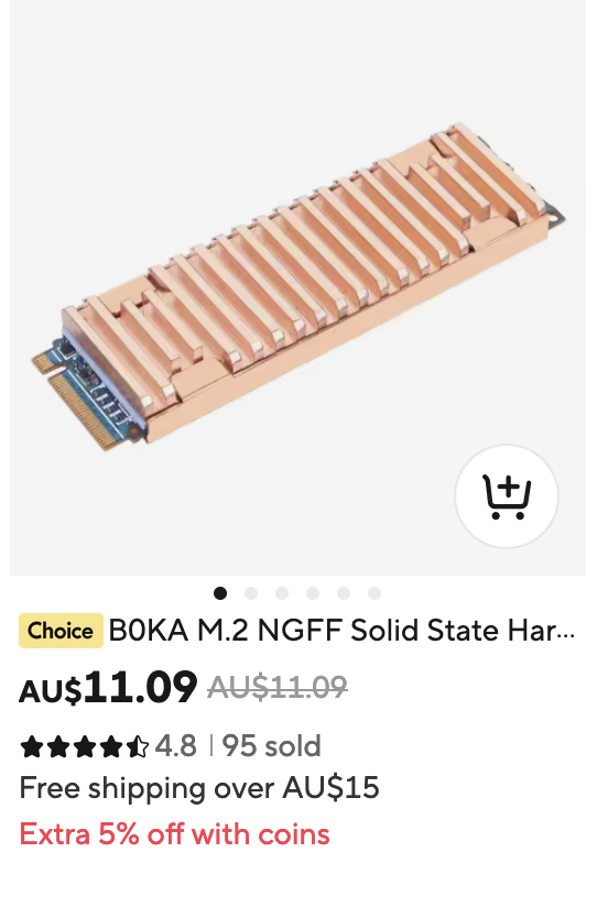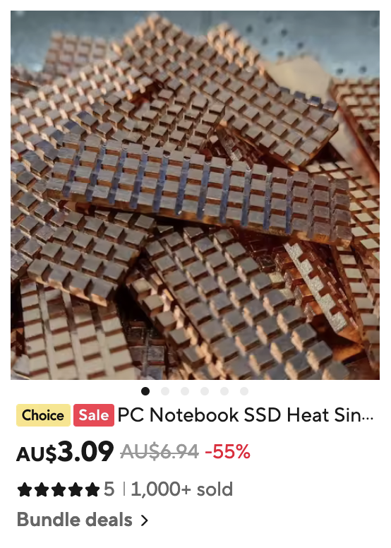 With so little space, I want as much air movement as possible. Reduced air space limits efficient cooling. I understand airflow is a more important factor for heat dispersal than total heatsink surface area (fins). It is airflow which is essential for removing radiated heat. A greater volume and faster movement of air = greater heat dispersal and a cooler running SSD or chip, fins or no fins. That is my opinion. The flat copper helps absorb heat from the controller and diffuse it more evenly throughout the heatsink. Fan then blows excess radiant heat away from the copper heatsink thus preventing heat build up in the NVMe operation. Generally, when NVMe temperature rises to 75° or above (depending on each models design tolerance), NVMe will throttle back to avoid damage.