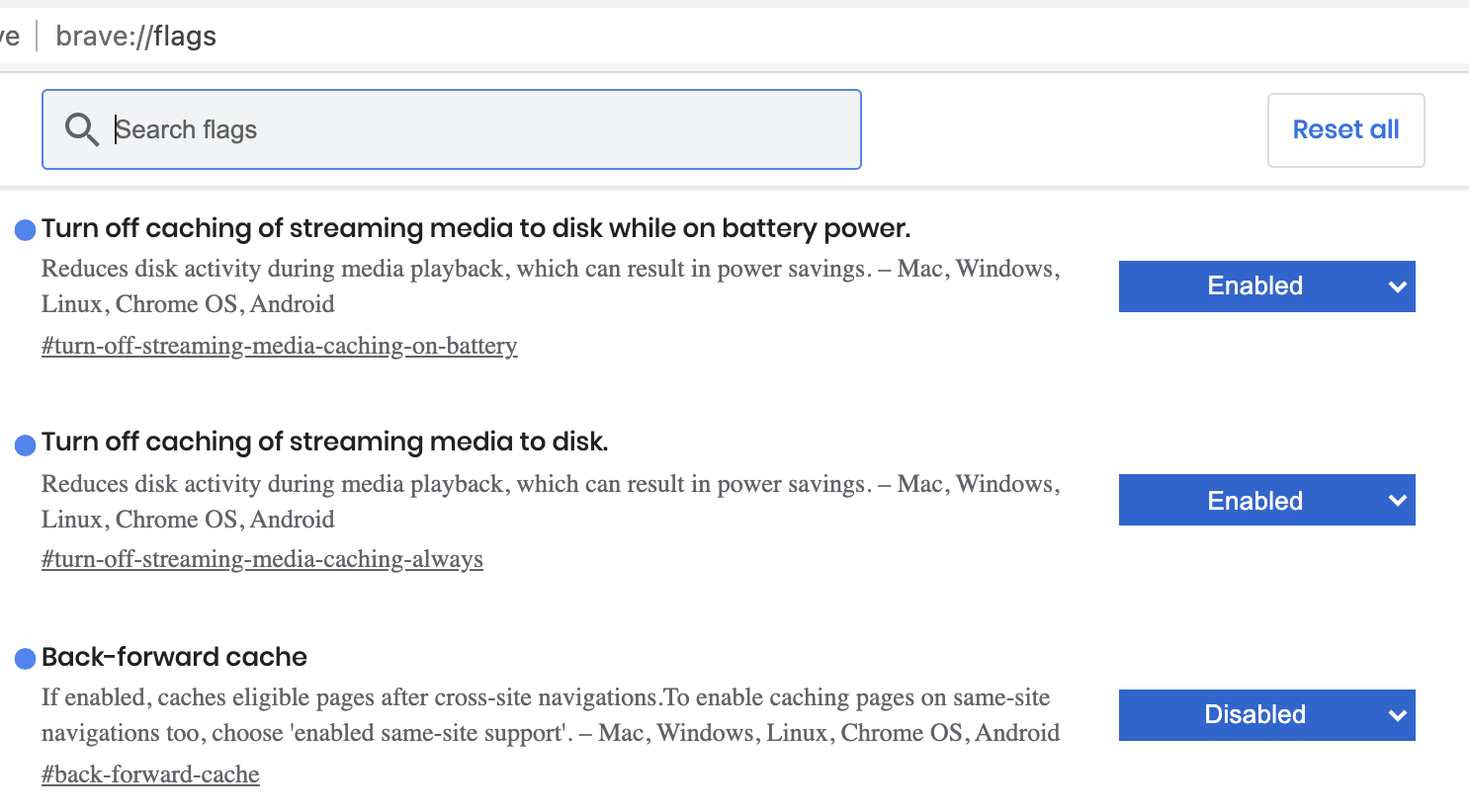 For Brave / Vivaldi: open a new tab and type chrome://flags .Once in here, search 'caching' and enable 'Turn off caching of streaming media to disk while on battery power' and 'Turn off caching of streaming media to disk', and disable 'Back-forward cache'. Restart the browser and you're done.