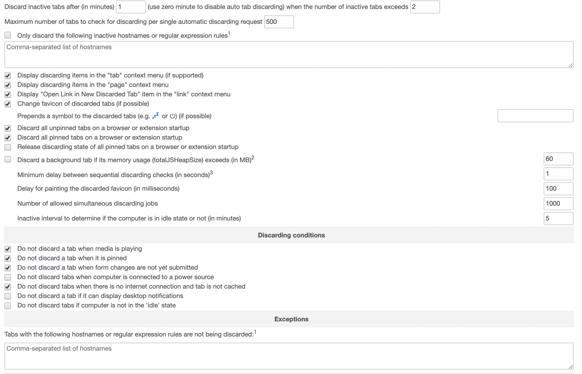 I recommend discarding inactive tabs after 1 minute, when the number of inactive tabs reaches 2. Set maximum number of tabs to check for discarding per automatic discarding request to 500, and the number of allowed simultaneous discarding jobs to 1000. The rest of the options are up to you.