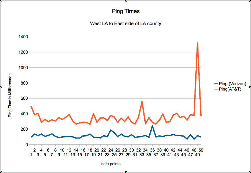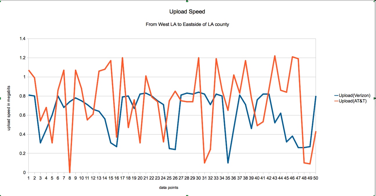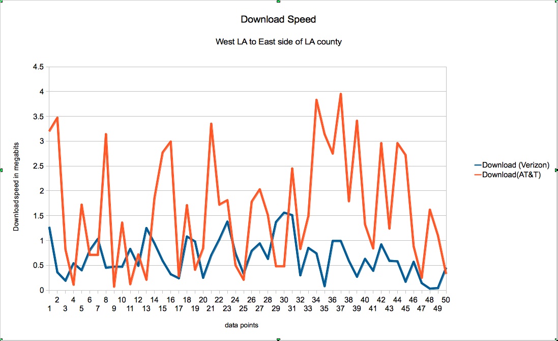 I was doing a bunch of things all over the county today and I took both ATT and Verizon iphones out with me and logged 51 data points each of ping, download and upload speeds. The Charts I present as attachments are to be read as traveling from West Los Angeles (Santa Monica) from the left, to West Covina on the right. I was in and out of 5-6 different cities today and while sitting around waiting in a car this afternoon going to santa monica for dinner, I also took some data on the free way from about mid city to Santa Monica. These readings are definitely not meant to be the definitive end all observation of data speeds in LA. They are merely what they are, my account and experience, which I do think gives a bit of insight into the two networks data speeds in LA.