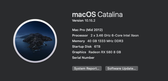 My system is 2009 4.1>5.1 MacPro. AMD Rx580 GPU, dual 3.46 CPU. I took all the drives out except one SATA mounted SSD that was formated clean with a brand new install of 10.14 in order to experiment with HW acceleration.