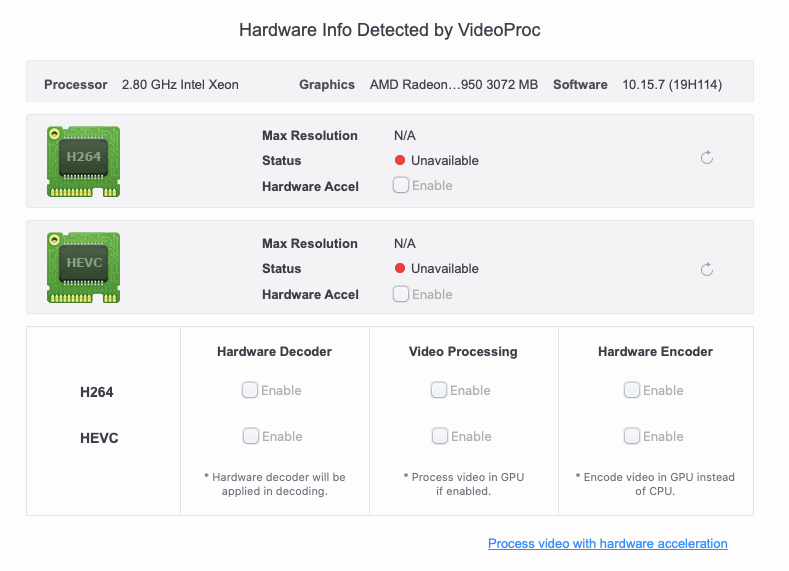 I've searched this thread and saw a few mentions about the 7950; just wanted to confirm that VideoProc cannot use this card for HW acceleration? I have a Dosdude v1.4.4 patched version of Catalina running on my 3,1 with a flashed 7950 and this is what VideoProc tells me: