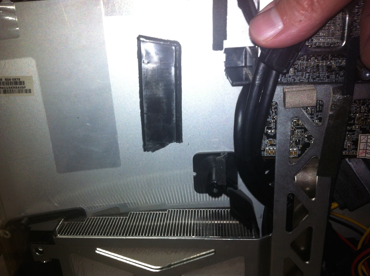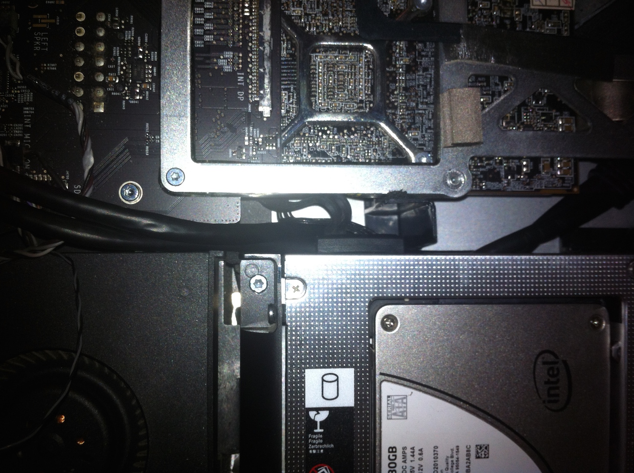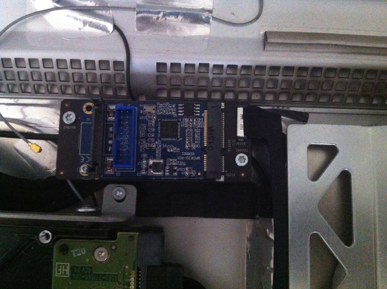 2) A back panel expansion connector. Closing the imac is almost impossible, because the back panel expansion connector to the mini pci-e card is very rigid and it collides with the screen panel. You'll need this modded low profile adapter. The height is just 7mm, but maybe a right angle adapter could work but I doubt there's just too little space in there.