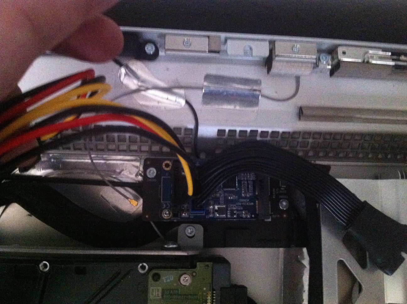- A sata power cable splitter in order for the card to power and mount the drives. The sata cable, even a right angle connector, it's too high and collide just as the 20-pin did and you'll not be able to close the imac. There's no slim low profile cable for an esata that I could find, so I had to remove the plastic protecting the connector header (some scissors and a LOT of patience, it's very hard to remove without damaging the wires) and have just the barebone connector that'll be around 7-8mm height and protect it with electrical tape. Now the imac closes, still it collides and you have to push a little and put the screws in place, but now it closes and works.