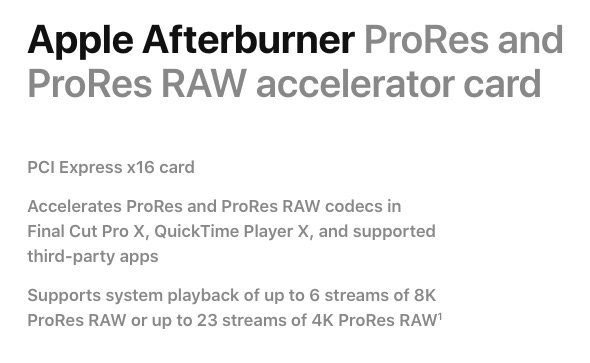 But that exists now. That what they did. How much further behind on modest ProRes RAW workloads would the MP 2019 be behind a Studio Max/Ultra if it didn't have Afterburner as an option?