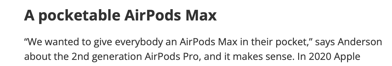As far as the AirPods Pro 2 vs the AirPods Max, the Max is still better, but it isn't a day and night comparison like a $9 pair of skull candy earbuds to the Max. Most of my music is instrumental (not classical) and the biggest thing I've noticed is that the Max sound a bit more spacious and there is more detail in the instruments. For example, I tried my best to do an A/B last night and dumbs in one track were just continuous rhythms backdrop on the AirPods Pro where as I could make out the impact of each drum strike on the Max. On the AirPods Pro everything is kind of jammed into one track whereas it's more spread out on the Max.