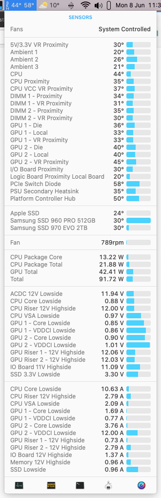 Fanny (to which I found a reference here in the forum as well) which looks way above what I would consider healthy. Unfortunately it's seldomly well-documented what sensor exactly corresponds to readouts shown by various tools. Also unfortunately, I didn't perform any pre-upgrade comparisons with all the same tools... The only direct comparison I have is what smcFanControl shows, and on that one, temps have gone down compared to before...