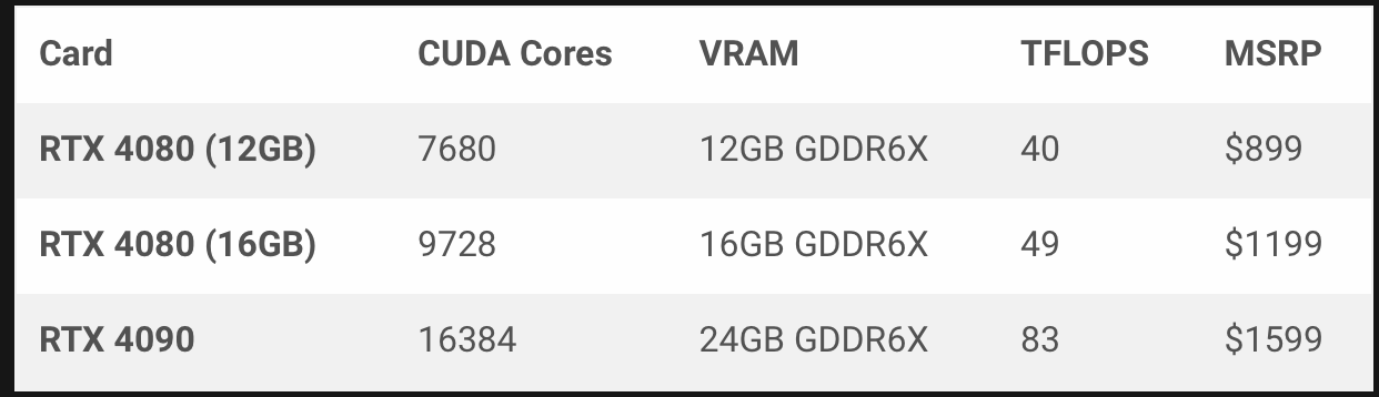 NVIDIA just unveiled the first of its next-generation GeForce graphics cards: RTX 4080 and RTX 4090. Card CUDA Cores VRAM Memory Interface TFLOPS MSRP RTX 4080 (12GB) 7680 12GB GDDR6X 192-bit 40 $899 RTX 4080 (16GB) 9728 16GB GDDR6X 256-bit 49 $1199 RTX 4090 16384 24GB GDDR6X 384-bit...