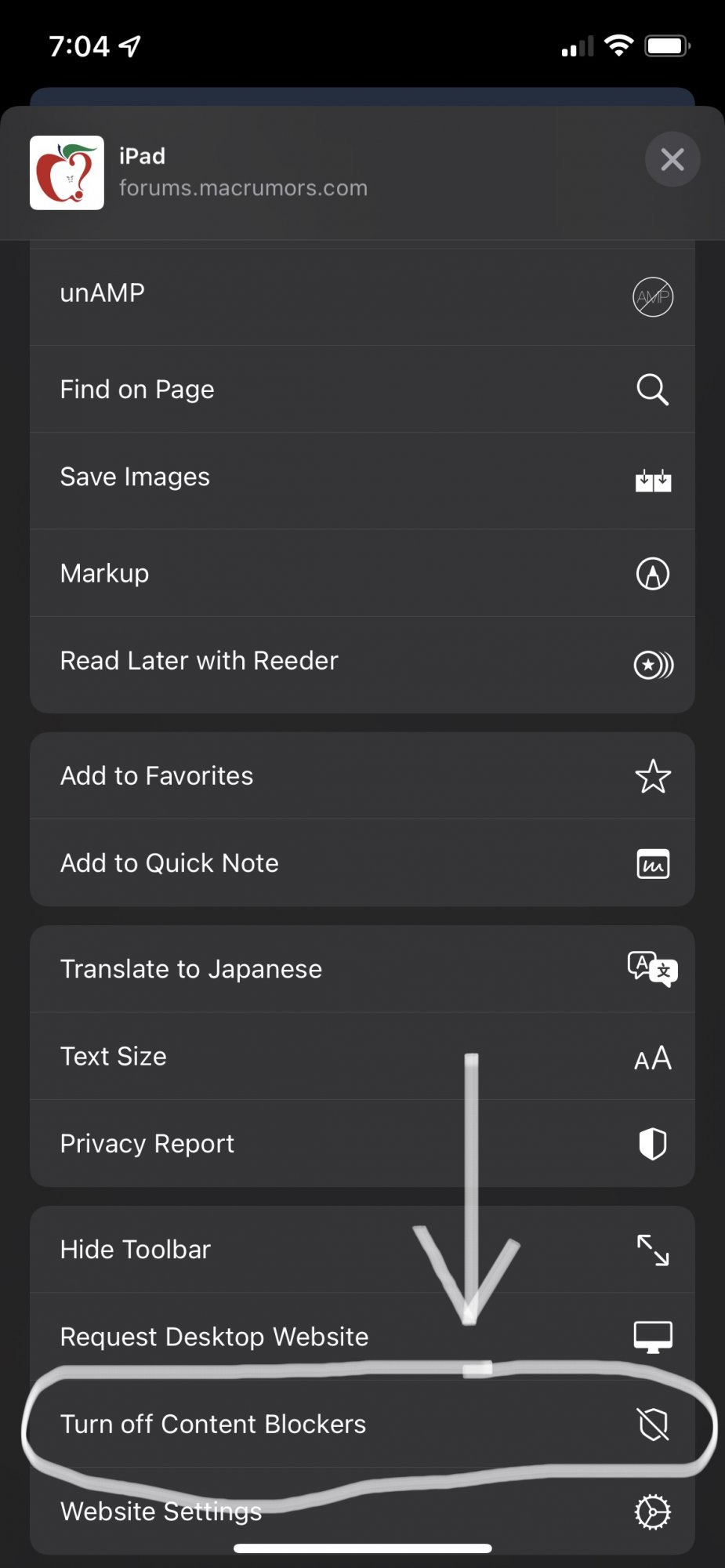 Also, the ‘Turn off Content Blockers’ option only applies to that page. It’ll turn back on if you reload normally, tap a link, or go to another site. This is exactly the same in iOS 14 as well.