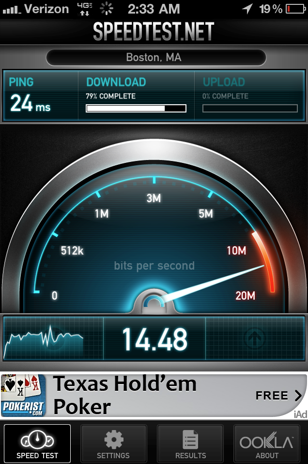 I took a picture after the speedtest was finished, and during it so you could see that it was running off of 3G. I think Verizon has been updating their towers or something. Anyway, this is amazing