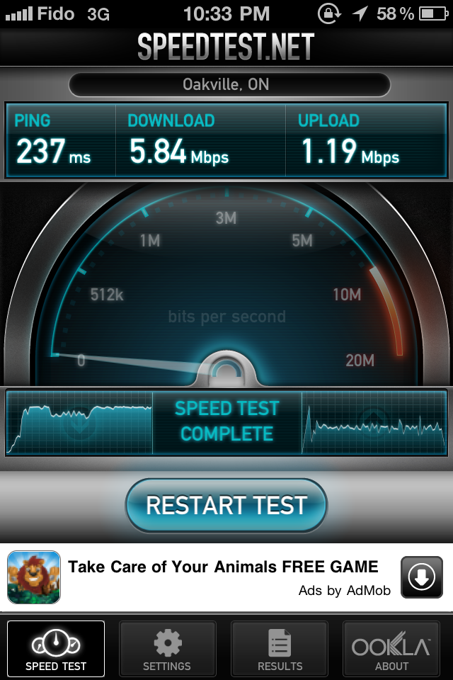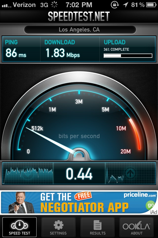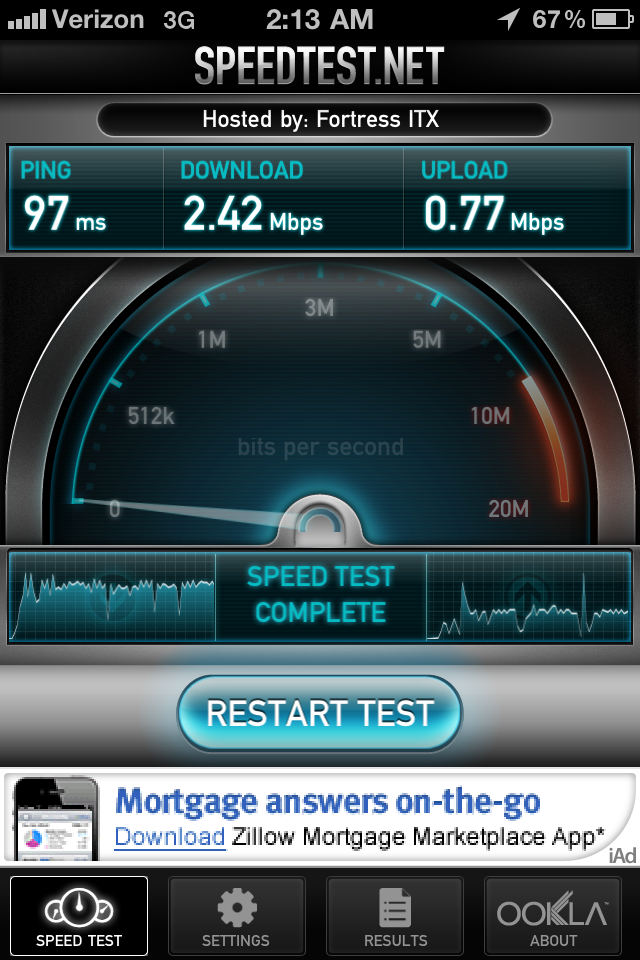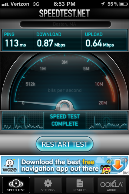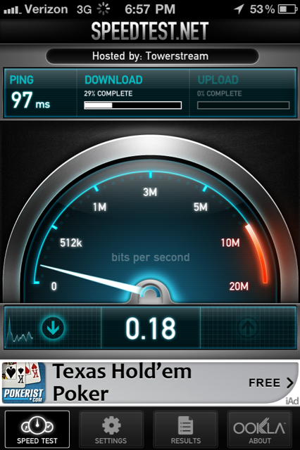 I took a picture after the speedtest was finished, and during it so you could see that it was running off of 3G. I think Verizon has been updating their towers or something. Anyway, this is amazing