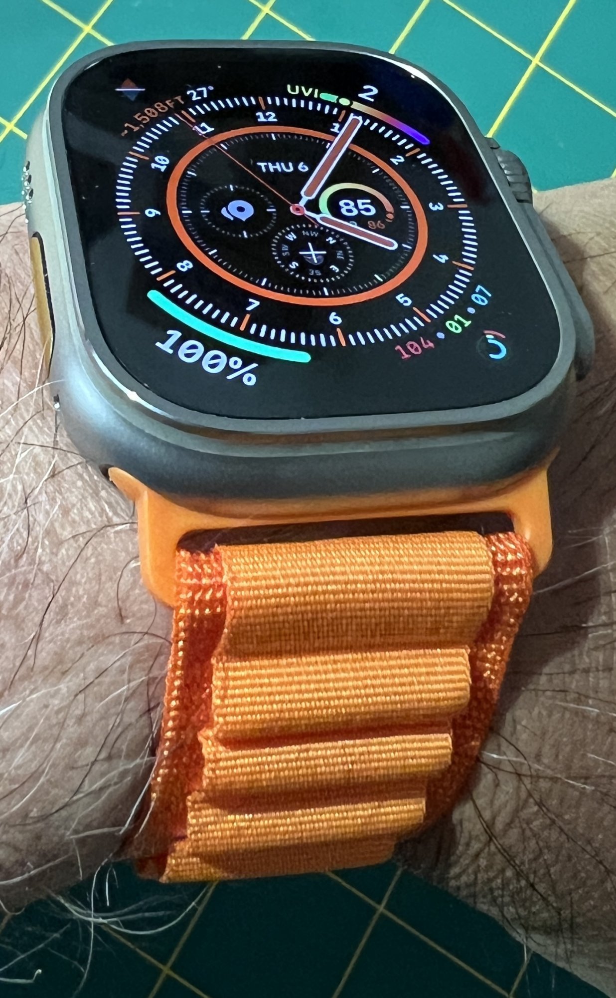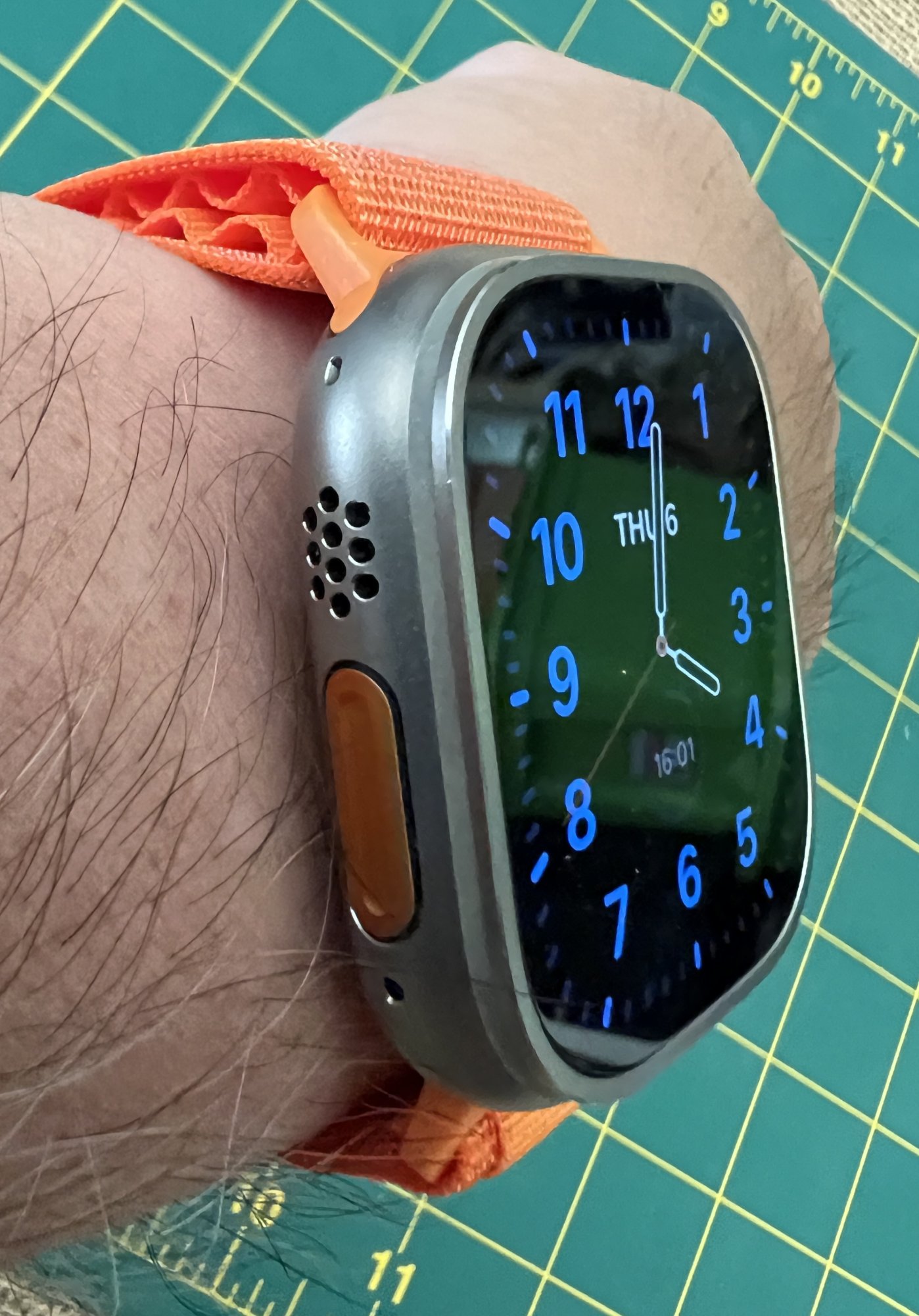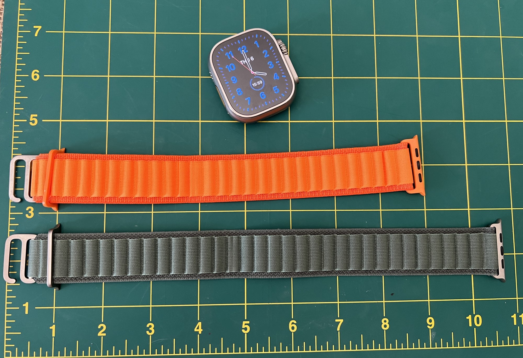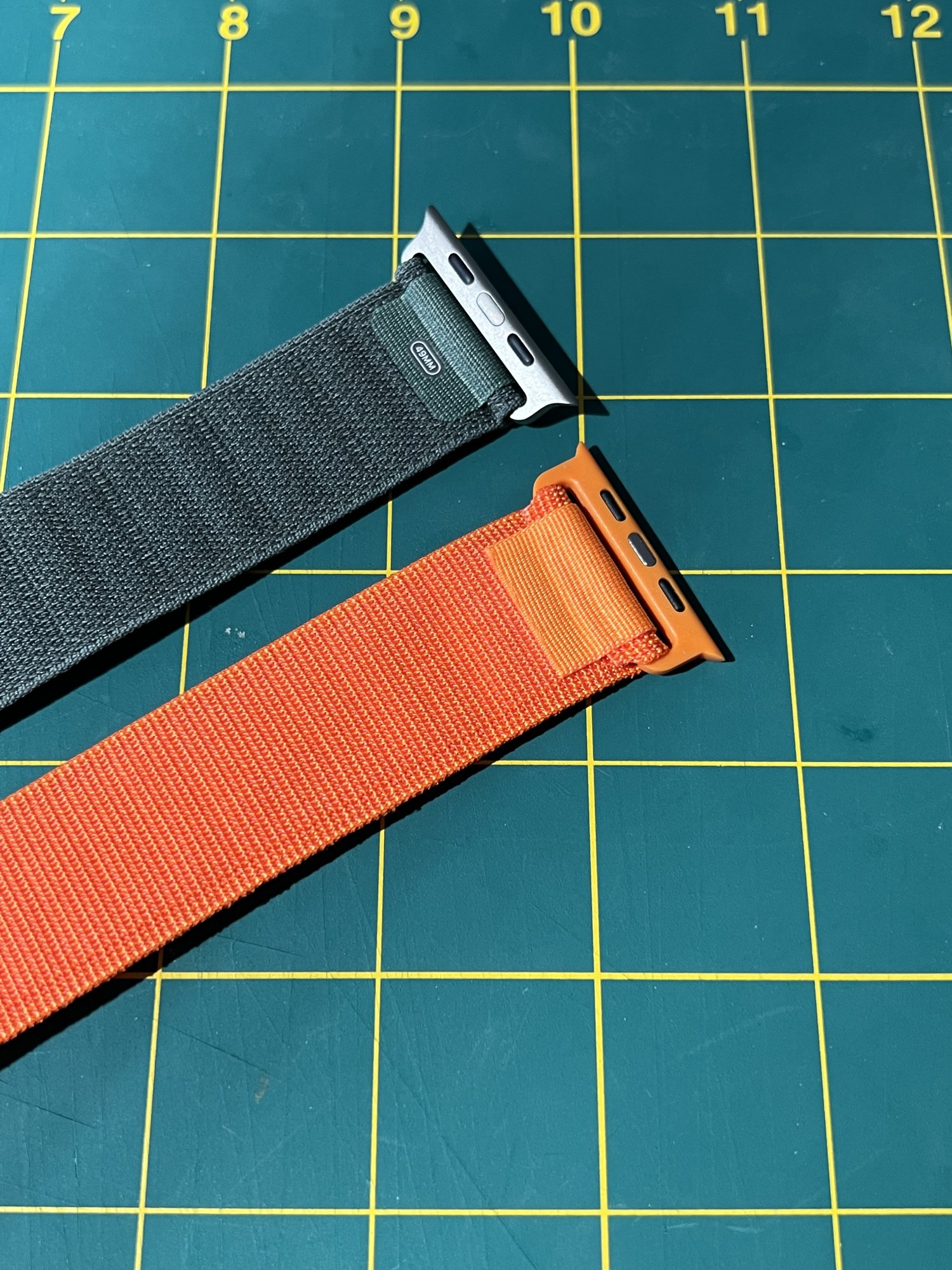 My initial assessment is that the large Zsuoop is almost 2 inches shorter than the large Apple Alpine Loop. The width is the same. The lugs are a polymer/plastic, not titanium, but the G-Hook appears to be the same. The lugs snap into the Ultra firmly and are snug. I don’t feel this will be an issue because even apple is using plastic in their Sport Loops now.