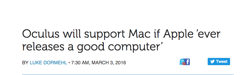 I'm sure if oculous wanted Mac Pro to work ... they would have optimized for an OPEN standard. Don't get fooled here. It's not an APPLE vs Oculous issue ... it's Oculous VS AMD/ATI.