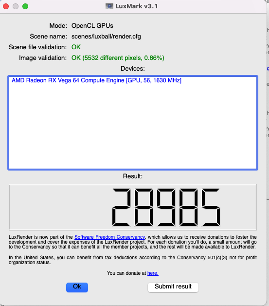 I downloaded Luxmark v3.1 and completed the test, the results is 28985 (I even seen a bit over 30000 somewhere in the middle of the test) but I'm still not convinced about CPU bottleneck.Try Luxmark, all benchmarks you ran are basically CPU single thread limiting on the cMP. Unless you use some unreasonable resolution (e.g. 8k), otherwise, very hard to compare the results with other computer that has much faster CPU.