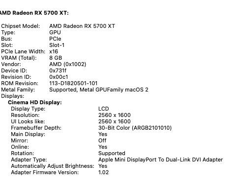 Correct. As I said in my original post, @caingraywood was using a hardware flasher (I think he said it was an RT809F). I don't know his methodology - he may have been flashing in situ, or he may have been physically replacing the chips. In any case, he wasn't using software flashing. Since a cMP can't even POST with an unpatched RX6x00 card, it's necessary to flash it using either a PC (Windows/Linux) or a hardware flasher (or, I suppose, a MP7,1?).
