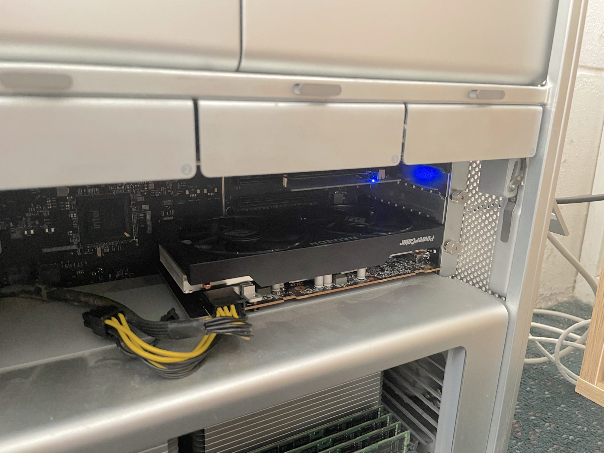 As it has only one single 8-pin PCIe connector, it can‘t draw more than 150 W from the Mac Pros motherboard Dual-6 pin power connectors. So a Pixlas mod shouldn‘t be necessary.