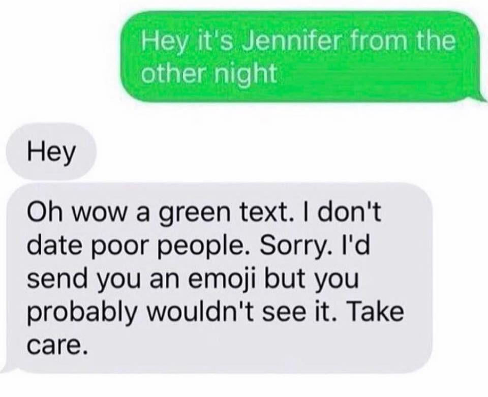 Also, there ARE people who completely dismiss anyone over a 'green text'. Plenty of forum threads about it on various sources. It happens a lot with dating sites. The girl sends a guy a text, he responds 'hey how are u?' and she says 'oh. green text. bye!' and there are many who assume an Android user is behind a green text and therefore not worth the effort, either because of group chats breaking or the still-promoted assumption that an Android user is a 'poor person'.