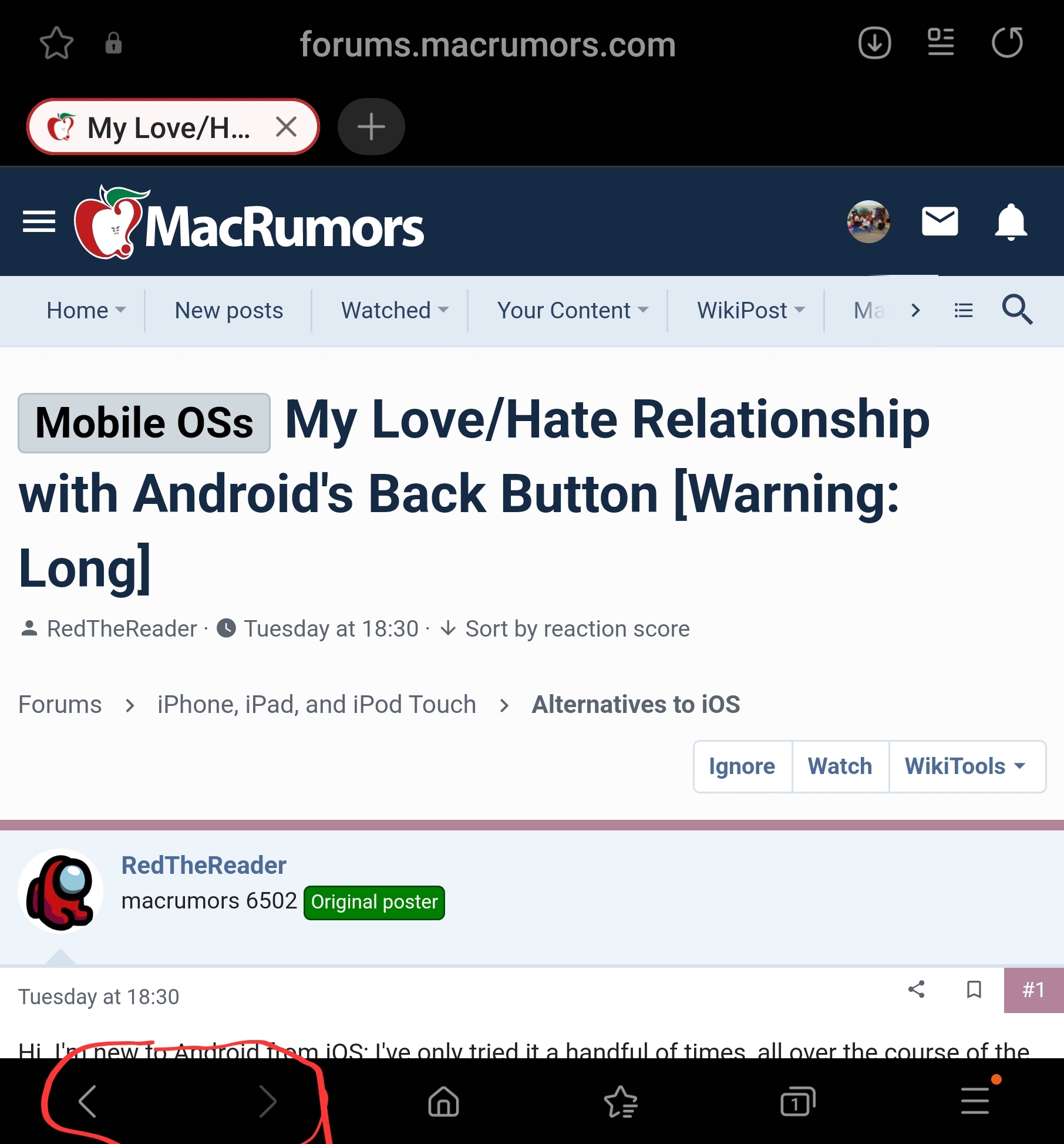 Unfortunately, Android's dual-sided back gesture gets in the way of this, so browsers can not implement it. I've got to turn off gesture navigation and use 3 button navigation in order to make it work the way it does everywhere else, and I don't want to do that. With gesture navigation on, going forward's done by pressing the browser's built in forward button… which is at least one menu layer deep. If this seems like a non-issue to you, take a step back and compare it to how it's done on a desktop system: ideally, for the fastest way you'll have a mouse with buttons for navigation or a trackpad. That way, it's just a button press or a swipe. Easy. But if you don't, you'll take your cursor up to the top corner and click the button. That's already very slow for most people, which is why power users will have a good mouse or trackpad setup. But this… this is the equivalent of having to click a drop down menu before you can click the actual button for forward. No one would tolerate that many clicks to do something so common on a desktop, because it's stupid slow.
