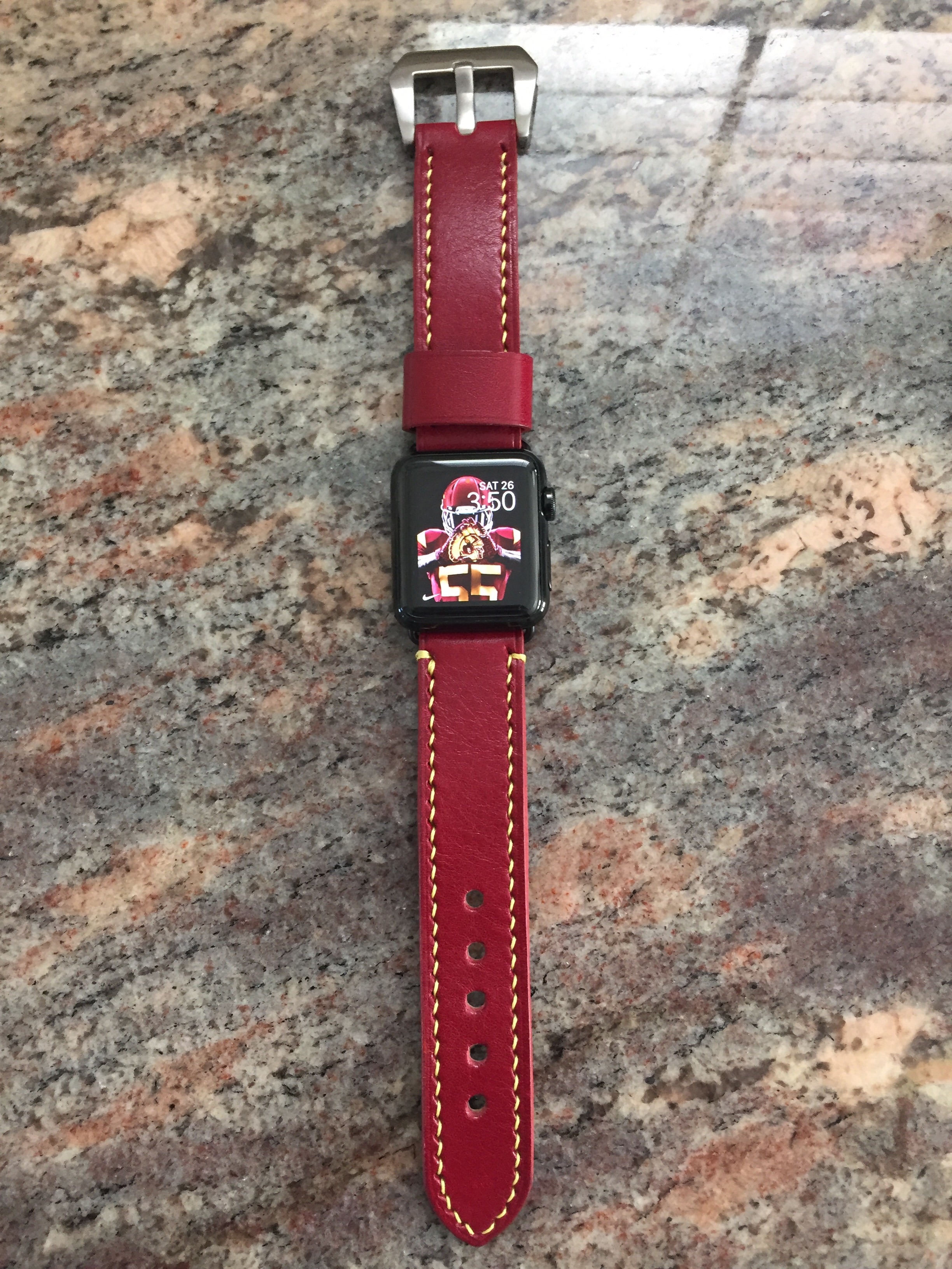 It is not a sports band so this is a bit off topic but I just got this as a gift - and just in time for tonight's game. I love it, a perfect color match for our Trojans. Just replying here since luckyblue wanted a cardinal red band.