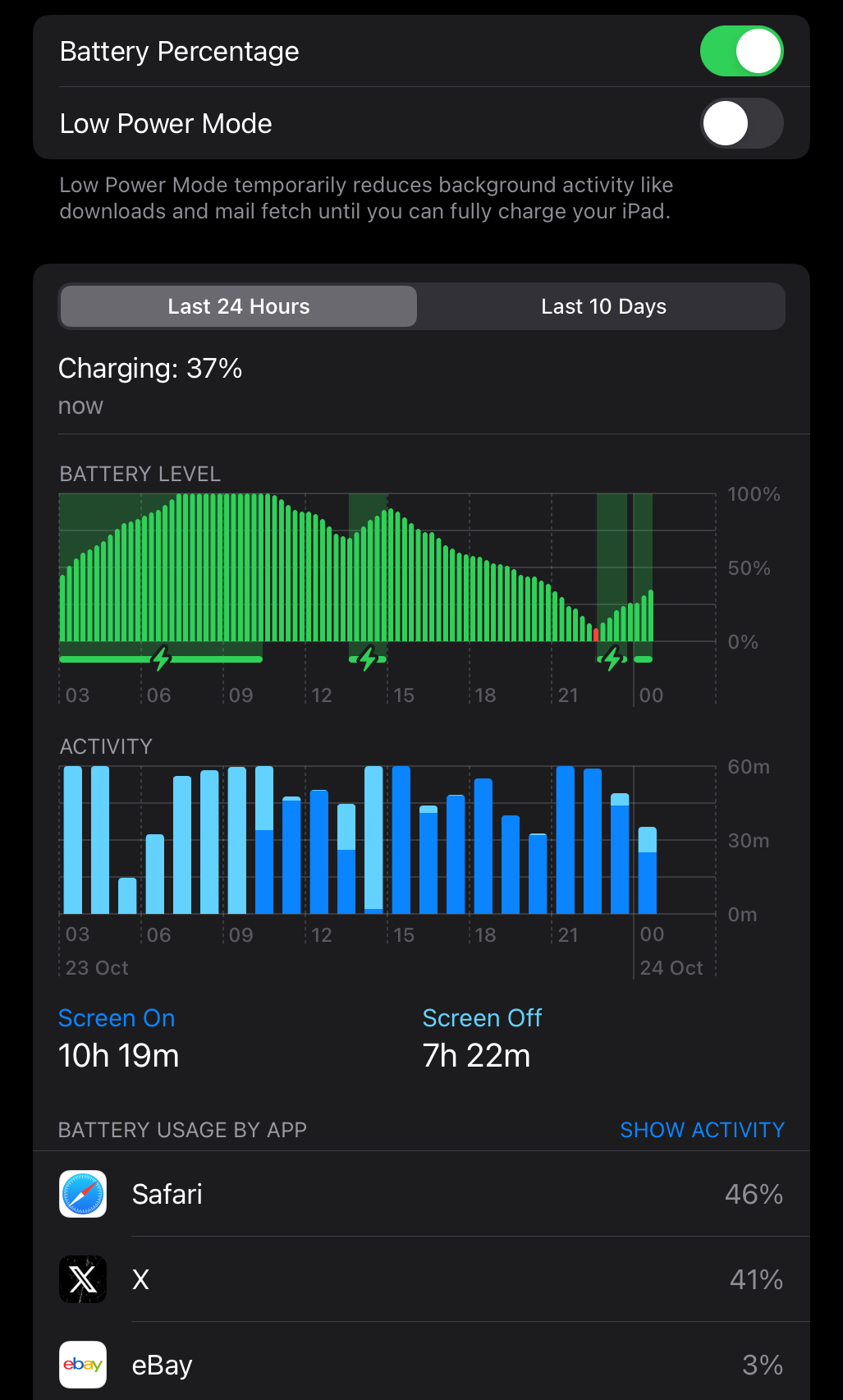 Just a quick update regarding my iPad Pro replacement. So far all running smoothly. I’m a fairly heavy user and often run the iPad while charging. I wouldn’t say battery capacity is great, but neither is it disappointing. My perception is that performance is overall noticeably slicker than what I was used to, and that’s what counts for me. For £129 I feel like I’ve got a nice new(ish) machine. Anyway, here’s the last 24 hours battery screenshot…