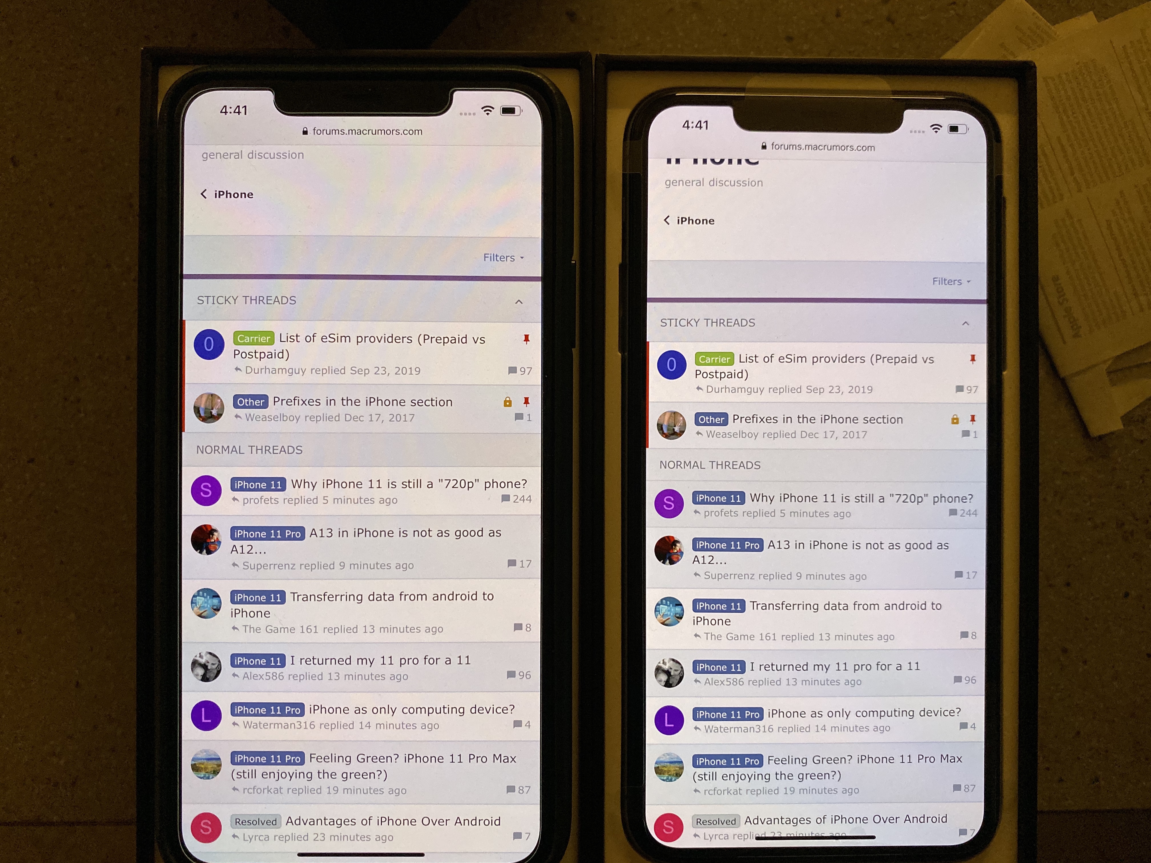 I'm so sick and tired of these Apple store employees who can never see the difference between any two screens you show them. My first 11 Pro had weak contrast and a slight green cast to the display. Genius said he couldn't see the difference even though seven other people I showed could. My express replacement has much better contrast but is more yellow. Showed it to a Genius today, even compared it directly beside a display unit which had perfect whites and even under that perfect store lighting I could still see mine had more yellow and he said he couldn't. I immediately saw that the store unit was what I wanted mine to look like and he saw no difference. Like, I understand that these differences are not as drastic as night shift on versus night shift off or something crazy like that, but I'm not blind. If you look closely you can see they are different.