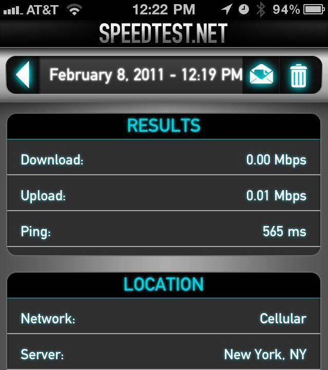 I'm near Queens and just did a speed test with my coworker who has an AT&T iPhone. We both loaded the same pages at the same time and he was shocked to see mine come up right away while his still loaded. After speed testing, my speed was about .75 Mbps, which I thought wasn't good until we saw his speed test results: .08 Mbps.